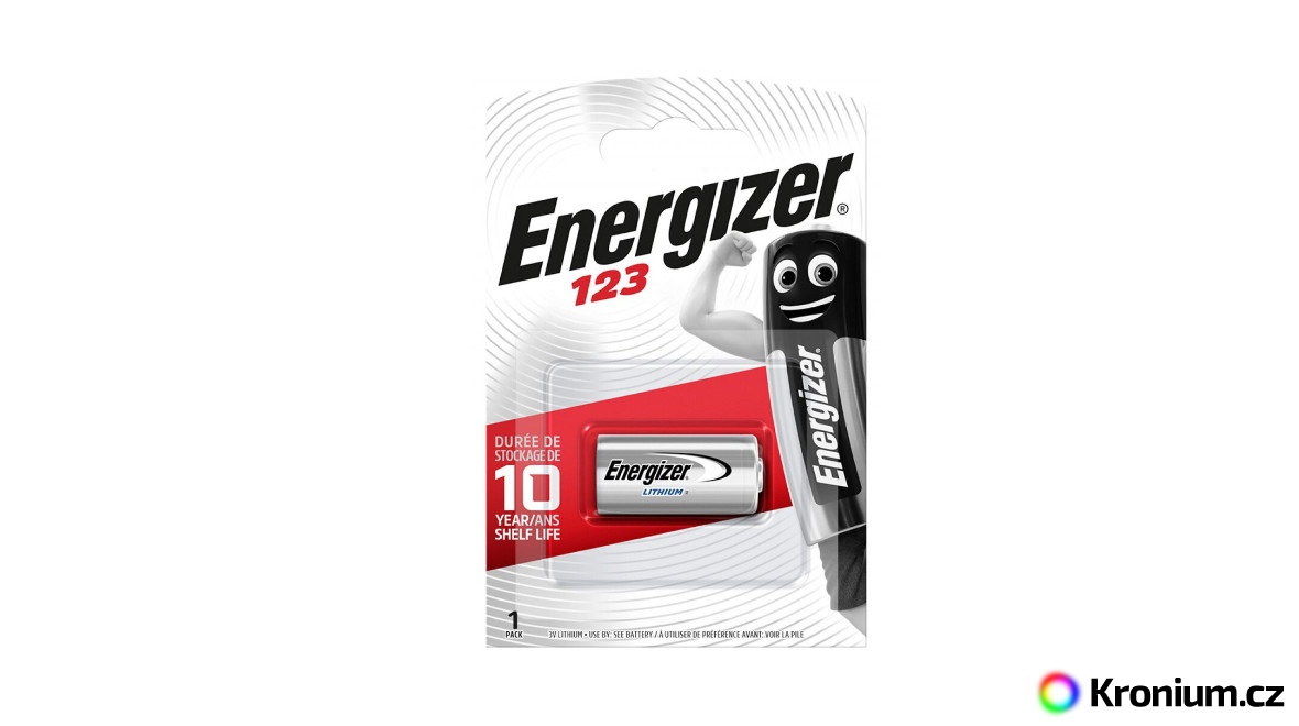 Jeden kus jednorázové lithiové baterie Energizer CR123 (CR123A, DL123, DL123A, CR17345, EL123AP, fotobaterie). Disponuje jednou z nejvyšších kapacit na trhu, má extrémní trvanlivost a odolnost při nízkých teplotách.