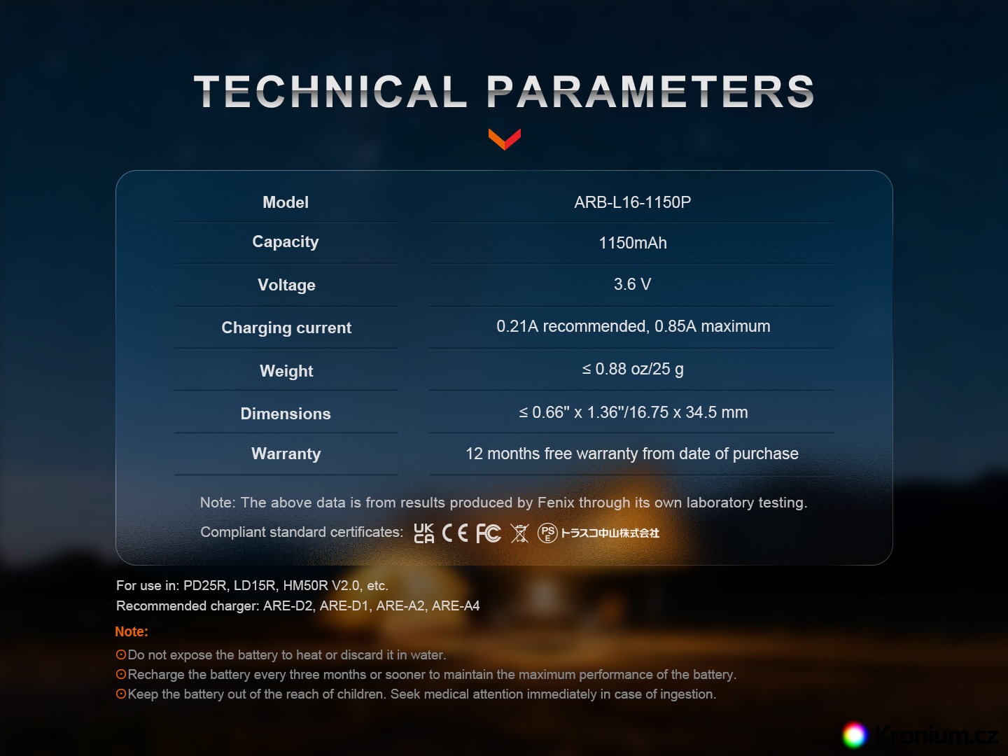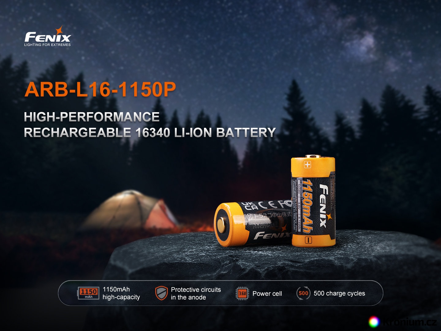 Špičková nabíjecí Li-ion baterie Fenix ARB-L16-1150P (velikost RCR123A / 16340) přichází s mimořádně vysokou kapacitou 1150 mAh. Díky tomu zajistí výrazně delší výdrž vašich zařízení. Je ideální volbou pro svítilny a čelovky s vysokým proudovým odběrem, jako jsou Fenix E18R V2.0, Fenix HM50R V2.0, Fenix HM51R V3.0, Fenix Vitae či Fenix PD25R. Tento akumulátor lze nabíjet přímo v nabíjecích svítilnách nebo v externích nabíječkách. Díky moderní Li-ion technologii netrpí paměťovým efektem a má minimální samovybíjení, takže je vždy připraven k použití.