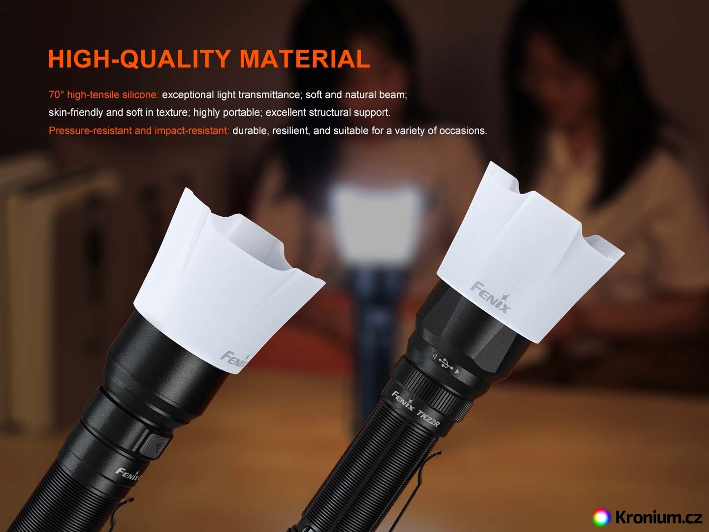 Bílý difuzér Fenix AOD-04 vhodný pro svítilny s průměrem hlavy 40 milimetrů. Difuzér rozptyluje původně velmi úzký světelný paprsek reflektoru svítilny do stran. Použití svítilny se tak rozšiřuje i o funkci lampičky například pro pohodlné osvětlení místnosti či stanu nebo lze baterku využít i jako signální lampu. Na horní stranu difuzéru je možné svítilnu také postavit.