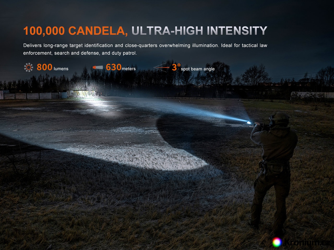 - Optika vytváří úzce zaostřený světelný kužel s dosvitem 630 metrů (100 000 cd).