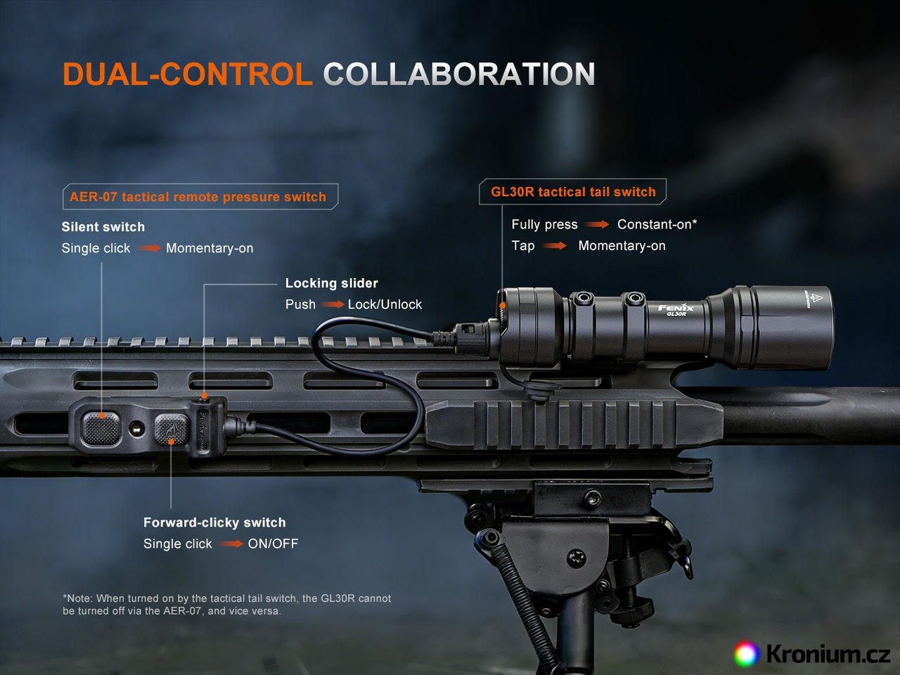 Svítilnu lze ovládat buď jejím taktickým zadním spínačem na těle, nebo přiloženým dálkovým tlakovým spínačem AER-07. Poznámka: Pokud svítilnu zapnete jedním ze spínačů, nelze ji vypnout tím druhým.