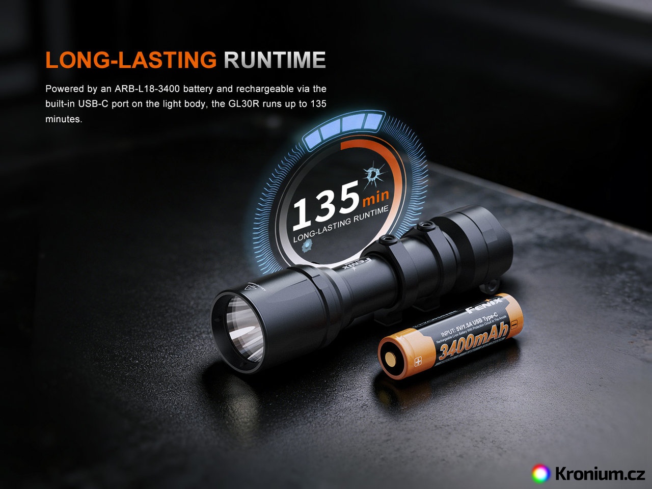 - 800 lumenů (135 minut s přibaleným akumulátorem, 70 minut s CR123A bateriemi).