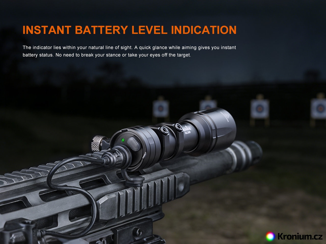 Indikace stavu baterie - po zapnutí svítilny se na 3 sekundy aktivuje LED indikátor. Pokud svítí zeleně, je baterie nabita na více než 85 %. Zelené blikání znamená 50-85 %. Červené svícení znamená 25-50 %. Červené blikání značí, že zbývá méně než 25 % kapacity. (Funkce je aktivní pouze při použití Li-ion akumulátoru).