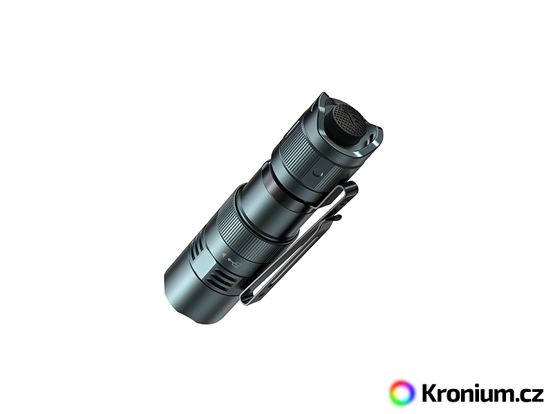 Nabíjení - Odšroubujte ochrannou matici pod hlavou svítilny a pomocí přiloženého USB-C kabelu ji zapojte do počítače, síťového USB adaptéru nebo USB adaptéru do auta (nejsou součástí balení). K nabíjení lze případně použít i libovolnou nabíječku na mobilní telefon s USB-C konektorem. Během nabíjení svítí indikační LED v tlačítku červeně, po plném nabití svítí zeleně. Nabíjení plně vybitého akumulátoru trvá cca 2 hodiny. Použitý Li-ion akumulátor netrpí paměťovým efektem, takže lze svítilnu kdykoliv dobíjet. Během nabíjení lze svítilnu rozsvítit jen v nejnižším režimu a to podržením bočního tlačítka po dobu 0,5 vteřiny.