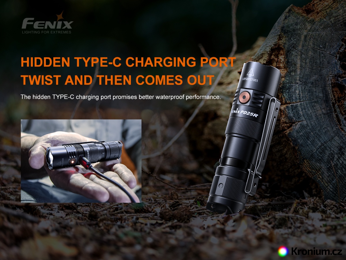 Kapesní nabíjecí svítilna Fenix PD25R nabízí světelný tok až 800 lumenů (ANSI) a dosvit až 250 metrů. Je napájena nabíjecím akumulátorem typu RCR123A (součástí balení), který se nabíjí přímo ve svítilně přes USB-C konektor, umístěným na boku. Nabíjecí zdířka je krytá šroubovací maticí, takže je dokonale chráněna proti vodě a nečistotám. Akumulátor lze nouzově nahradit i jednorázovou baterii CR123A. Jako světelný zdroj je použita špičková LED Luminus SST-20 s životností 50 000 hodin. Koncovka svítilny je osazena taktickým spínačem pro rychlé zapnutí a vypnutí, režimy výkonu se přepínají druhým tlačítkem na boku. Svítilna disponuje šesti režimy svícení, včetně zábleskového stroboskopu. V nejnižším režimu vydrží svítit až 70 hodin. Díky hmotnosti pouhých 78 gramů lze svítilnu nosit stále u sebe (EDC) pro běžné každodenní použití, v práci i při sportu.