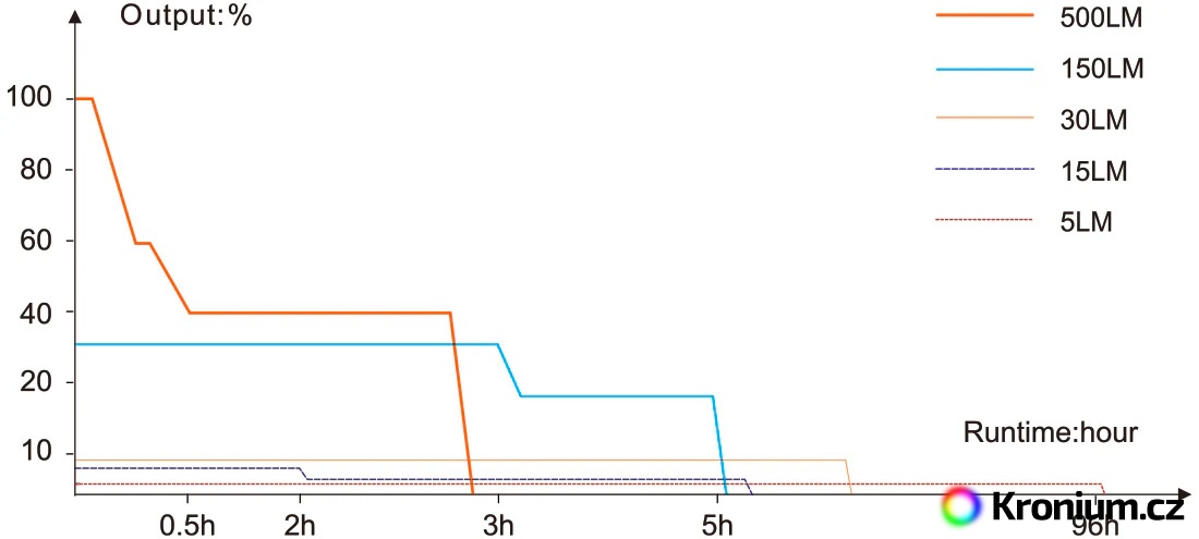 - Čtyři režimy bílého světla: 500 lumenů (2,8 hodiny) -> 150 lumenů (5,5 hodiny) -> 30 lumenů (23 hodin) -> 5 lumenů (96,8 hodiny).