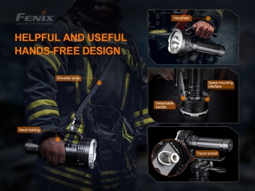 Svítilna je vybavena pěti indikačními LED, které ukazují stav nabití akumulátoru. Navíc je možné svítilnu nouzově použít i jako powerbanku a nabíjet z ní další USB zařízení. Svítilna má v základním balení odnímatelné držadlo, na které lze upevnit závěsné oko a závit na stativ. Svítilnu je tak možné nosit v ruce, nebo pomocí popruhu pohodlně přes rameno či ji upevnit na stativ a použít jako stacionární osvětlení. Tato vyhledávací svítilna je vhodná především pro záchranné a průzkumné operace. Výborně se hodí i k ostraze velkých objektů či pro všechny nadšence do svítilen. Potěší jak profesionály, tak i ty nejnáročnější uživatele.