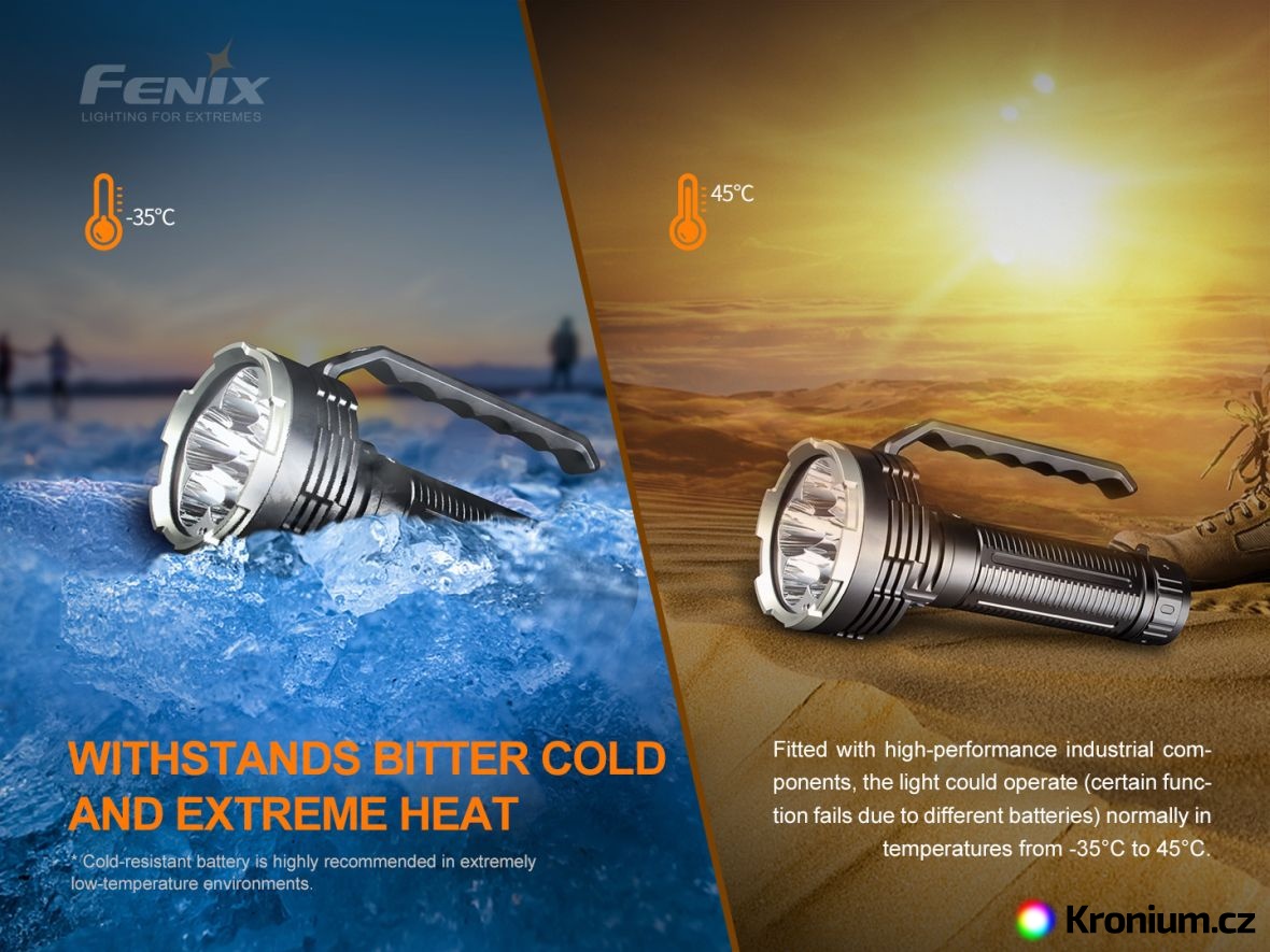Nová ultra výkonná nabíjecí svítilna Fenix LR80R přináší extrémní světelný tok až 18000 lumenů (ANSI) a dosvit až 1130 metrů. Svého výkonu dosahuje pomocí šesti špičkových LED Luminus SST-70 s životností 50000 hodin svícení, které jsou napájeny z interního vysokoproudového Li-ion akumulátoru s kapacitou 86,4 Wh. Akumulátor se dobíjí přímo ve svítilně přes moderní USB-C konektor s podporou rychlonabíjecích protokolů. S přiloženým 45W USB zdrojem se nabije již za čtyři hodiny. Svítilna nabízí ovládání pomocí dvou tlačítek, kterými je možné odděleně ovládat vysoké a nízké režimy svícení a to včetně dvou skrytých zábleskových režimů SOS a stroboskop.