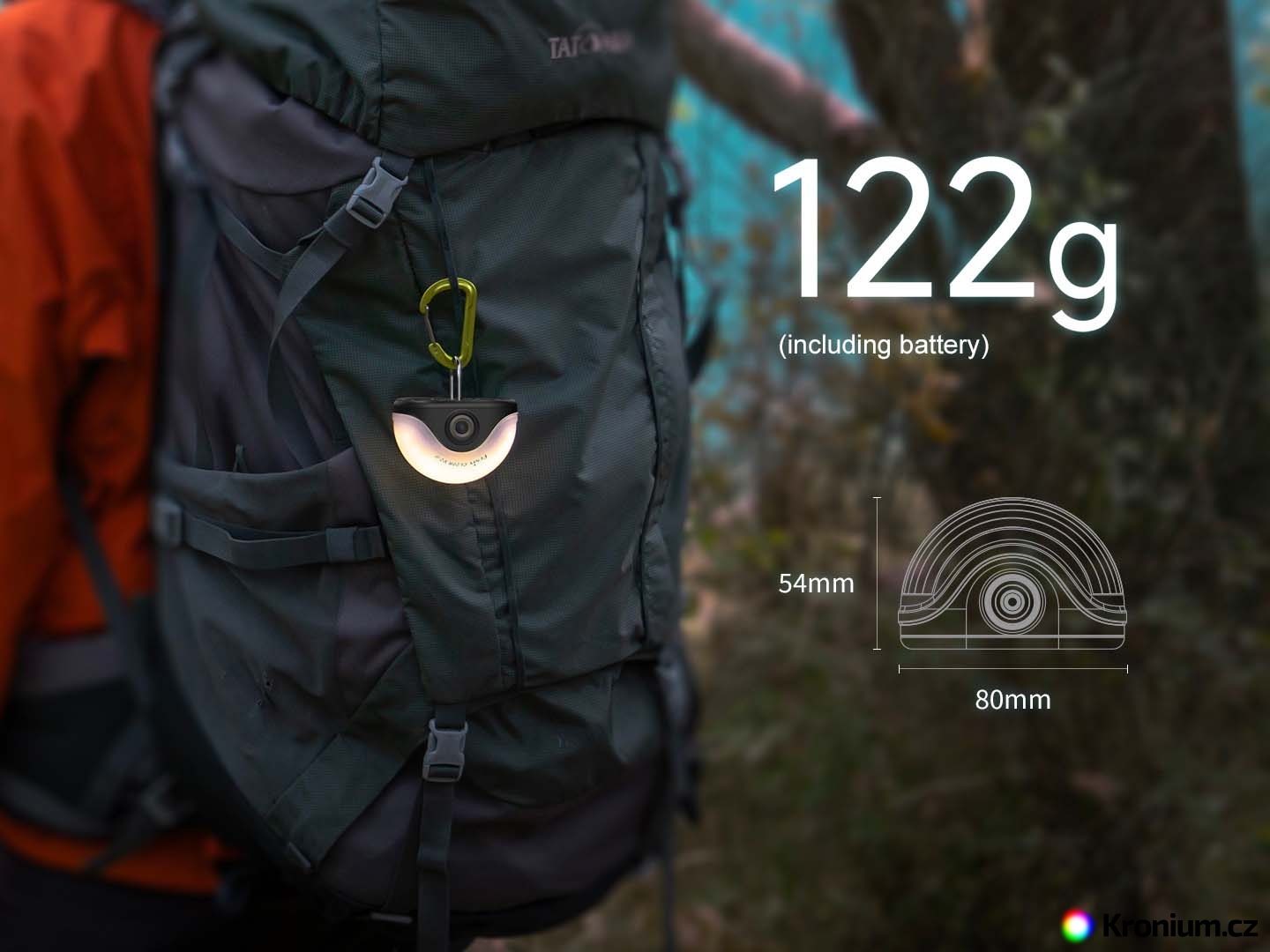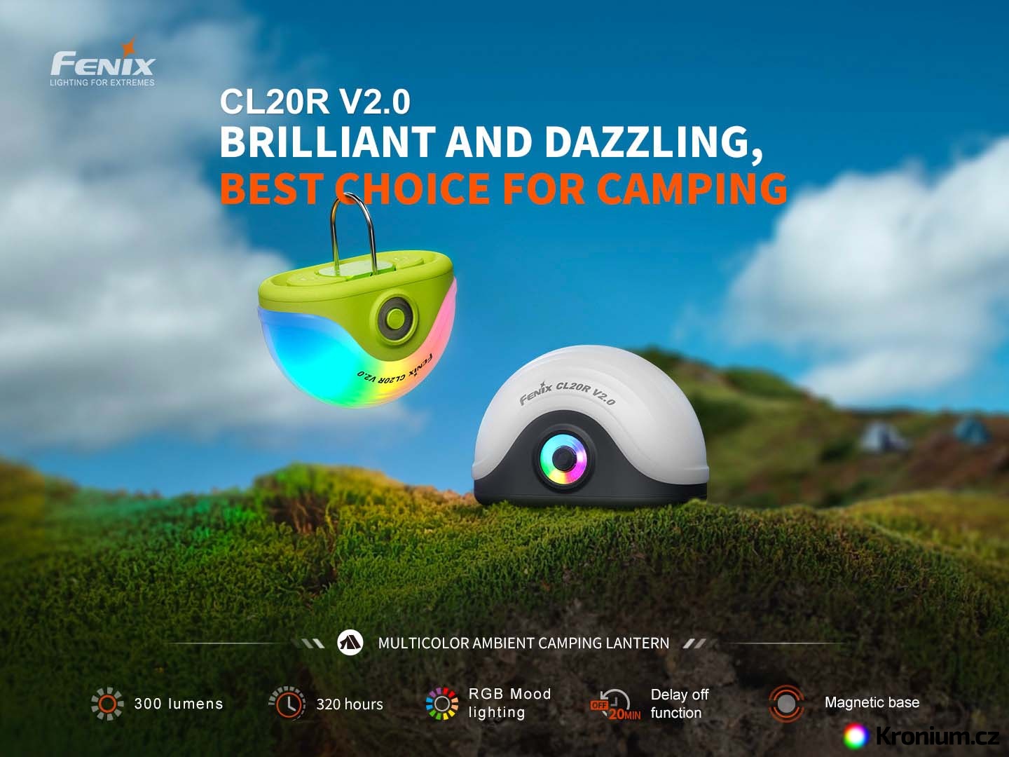 Hledáte spolehlivé a všestranné světlo na kempování, stanování, rybaření nebo večery na terase? Právě jste ho našli. Fenix CL20R V2.0 je kompaktní a výkonná nabíjecí kempingová lucerna, kterou můžete použít pro osvětlení místnosti, stanu či pracovního stolu. Dvacet sedm vysoce jasných diod ukrytých pod polokulovým difuzérem poskytuje světelný tok až 300 lumenů (ANSI) s příjemným neutrálním odstínem bílého světla (3700 - 4200 K). Výhodou tohoto odstínu je přirozenější a kontrastnější podání barev, které neunavuje oči. Pro vytvoření atmosféry je lucerna vybavena i dvaceti čtyřmi RGB diodami pro barevné svícení. Napájení zajišťuje vyměnitelný Li-ion akumulátor Fenix ARB-LP1900 s kapacitou 1900 mAh, který se pohodlně dobíjí přes moderní USB-C konektor. V nouzi ho lze nahradit třemi běžnými AAA bateriemi. Díky odolné konstrukci s krytím IP65 se nezalekne ani deště. Spodní strana je opatřena výklopným závěsným okem a silným neodymovým magnetem, takže ji snadno připevníte na stanovou konstrukci, kapotu auta nebo jakýkoliv železný povrch. S váhou pouhých 122 gramů je ideálním outdoorovým světlem na cesty.