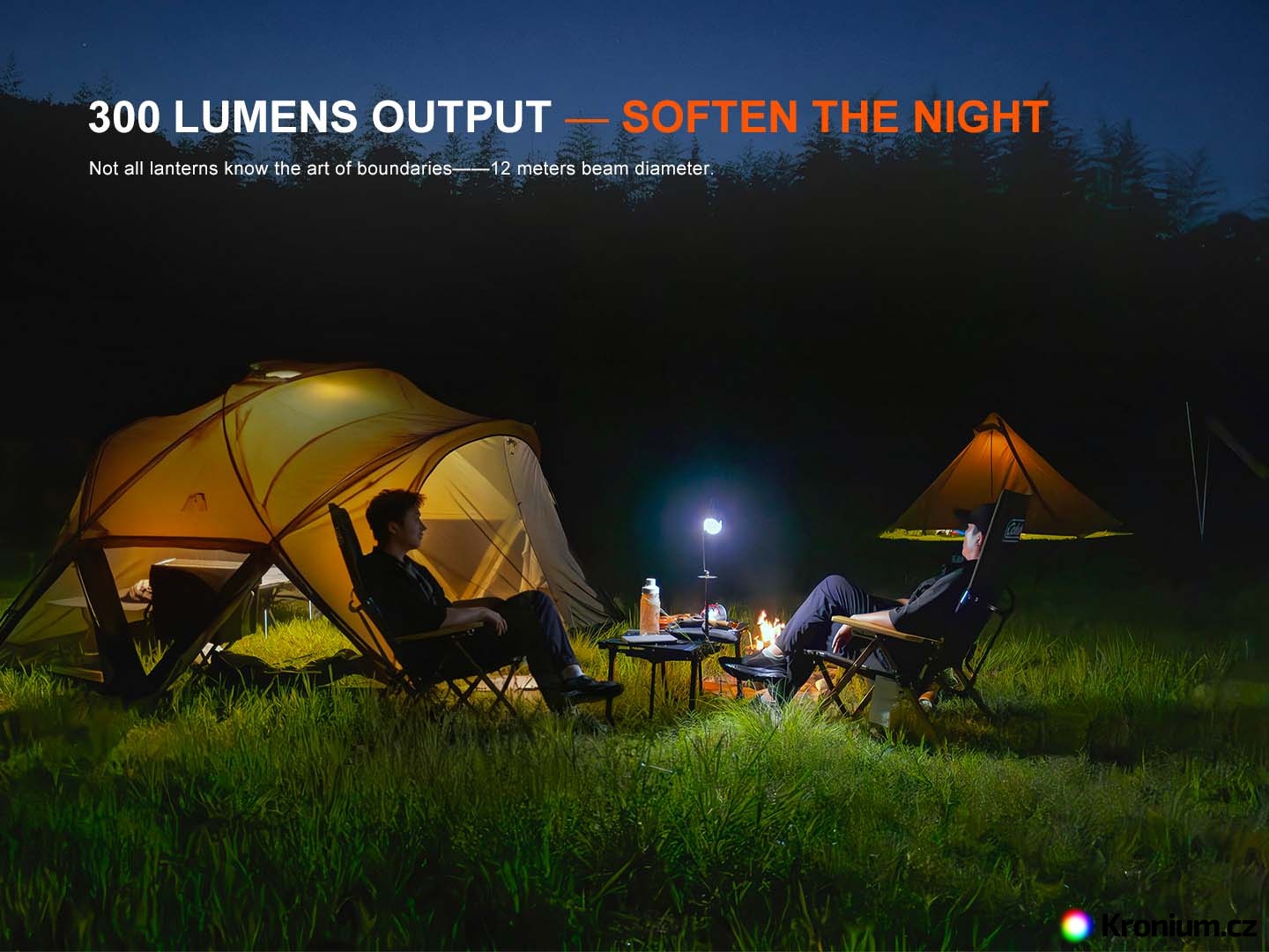 - Čtyři režimy výkonu: 300 lumenů (5,9 hodiny) -> 130 lumenů (15 hodin) -> 30 lumenů (32 hodin) -> 1 lumen (320 hodin).