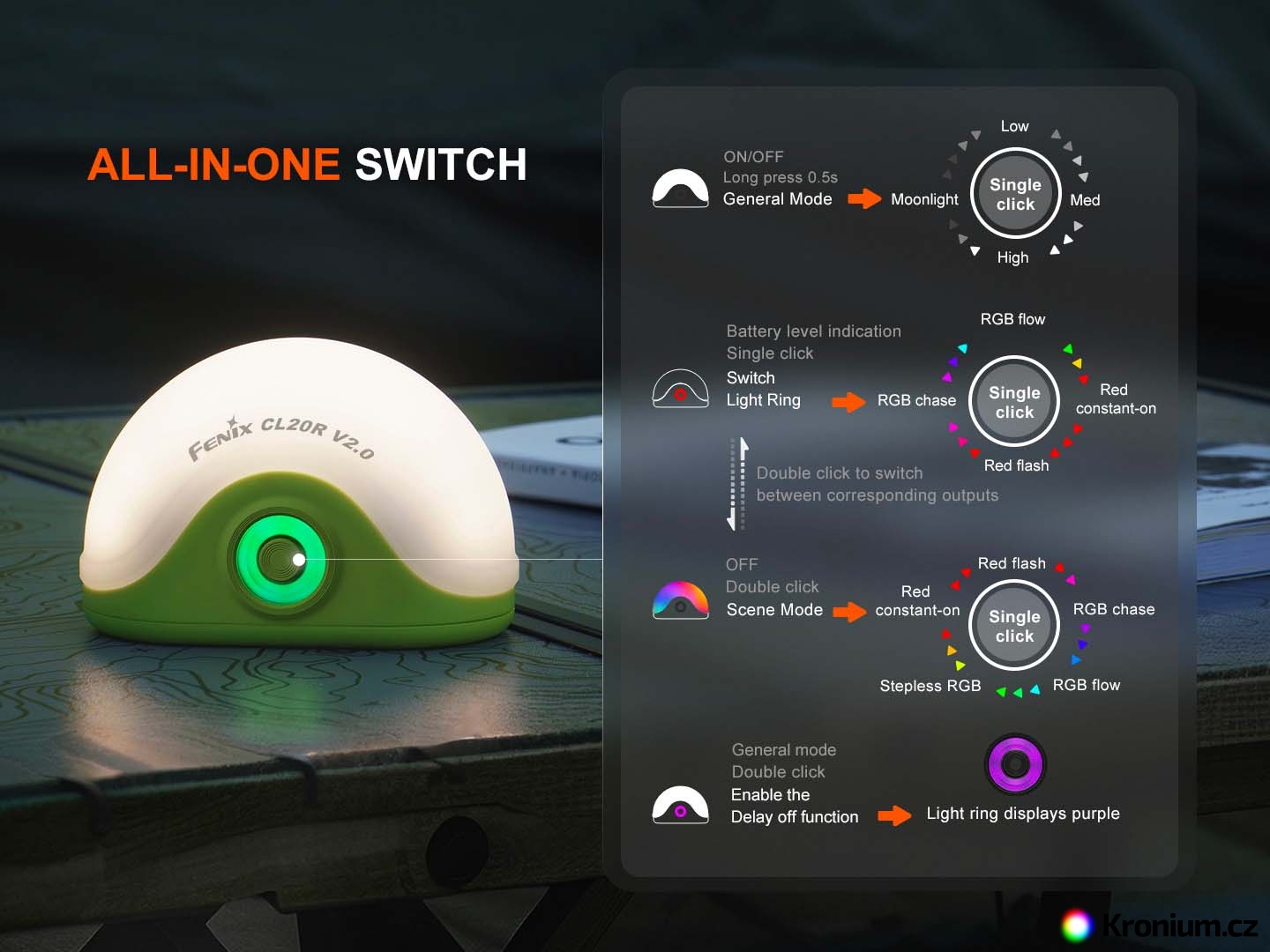 Zapnutí/vypnutí a přepínání režimů výkonu - Lucerna se zapne do bílého světla podržením spínače po dobu 0,5 sekundy, pro zapnutí barevných režimů spínač dvakrát rychle stiskněte. Pro zapnutí světelného prstence stiskněte jednou spínač a poté znovu během 3 sekund. Jednotlivé režimy svícení zvoleného způsobu svícení se přepínají stiskem spínače. Lucerna se vypne podržením spínače po dobu 0,5 sekundy.