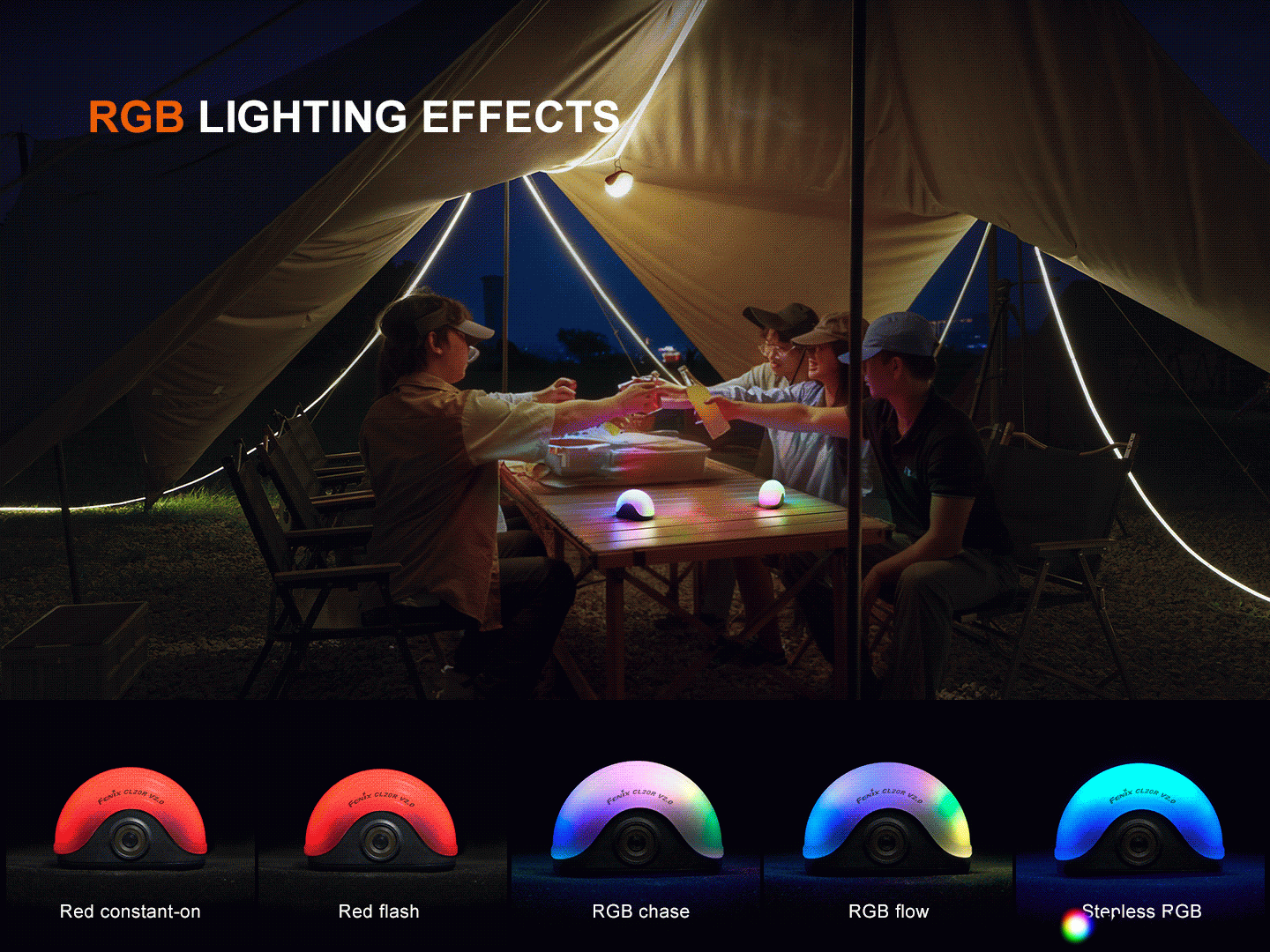 - Pět režimu červeného a RGB světla: RGB s plynulou volbou odstínu 25 lumenů (6,7 hodiny) -> RGB přebíhání 12 lumenů (10 hodin) -> RGB přelévání 10 lumenů (10 hodin) -> červené světlo 1,5 lumenu (40 hodin) -> červené blikání 1,5 lumenu (80 hodin).