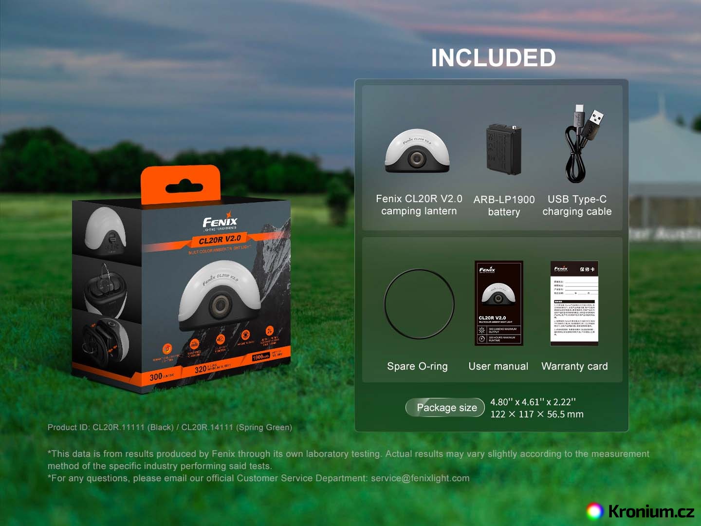 - K lampě je přiložen nabíjecí USB-C kabel, akumulátor Fenix ARB-LP1900, a náhradní o-kroužek.
