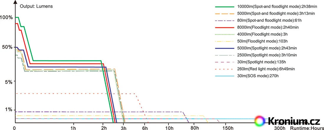 - Dálkový a široký reflektor: plynule regulovatelný výkon 10000 lumenů až 80 lumenů s výdrží 2,6 – 61 hodin.