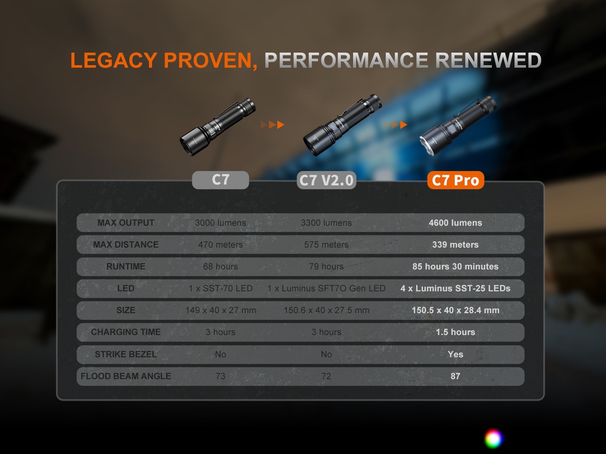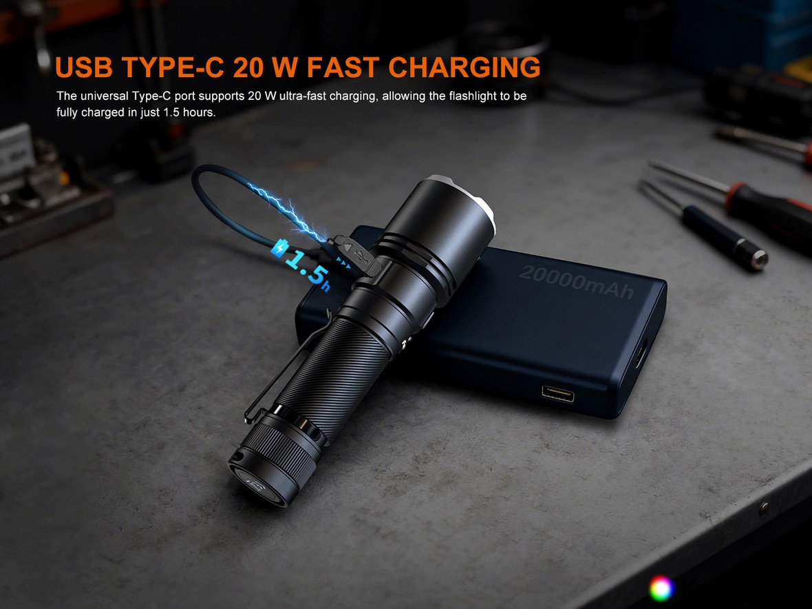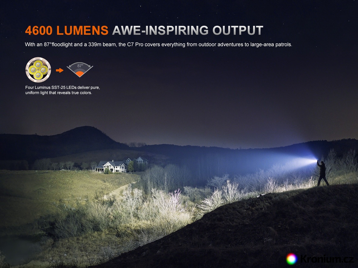 Fenix C7 PRO je nekompromisní nabíjecí svítilna stvořená pro ty, kteří vyžadují extrémní výkon a maximální spolehlivost. Nabízí skvělý světelný tok až 4600 lumenů (ANSI) s dosvitem do vzdálenosti neuvěřitelných 339 metrů. Srdcem svítilny je špičkový Li-ion akumulátor typu 21700 s kapacitou 5000 mAh (je součástí balení), který pohodlně a rychle nabijete přímo ve svítilně přes moderní USB-C konektor.