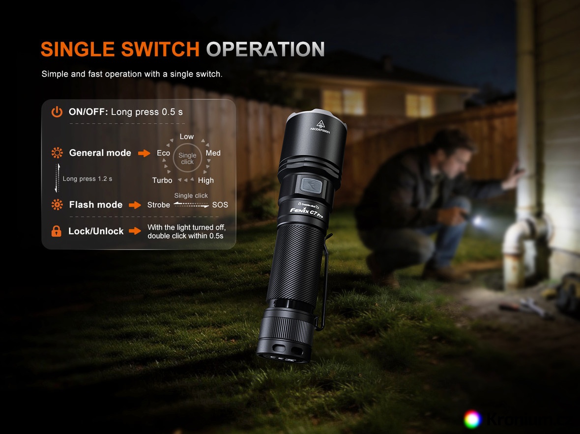 Svítilna se pyšní promyšlenou ergonomií a mimořádnou všestranností. Sedm světelných režimů vám dává naprostou kontrolu – od oslepujícího maximálního výkonu až po úsporný režim s výdrží více než tři dny nepřetržitého svícení. K dispozici je i stroboskop pro řešení krizových situací a sebeobranu, nebo SOS signál. Zásadní výhodou je magnetická koncovka, díky které svítilnu snadno uchytíte na cokoliv železného a uvolníte si tak ruce pro práci. O stabilní výkon se stará elektronika s konstantním proudem, která zajistí, že svítilna nepohasíná ani při pozvolném vybíjení baterie. Díky prvotřídnímu zpracování a skvělému poměru ceny a výkonu je Fenix C7 PRO dokonalým nástrojem pro průmyslové provozy, domácí kutilství i jako ideální outdoorový parťák pro náročné dobrodružství.