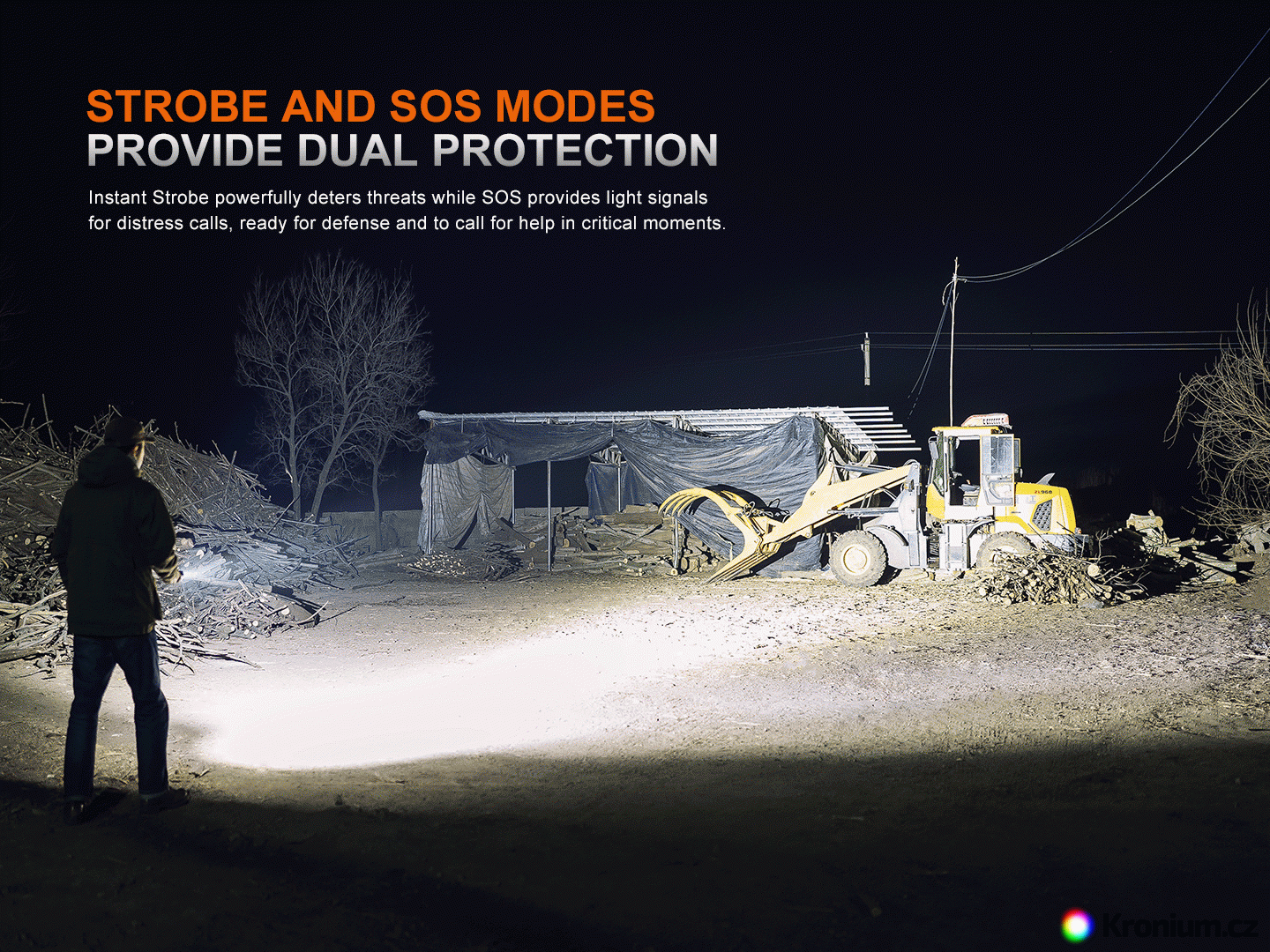 - Sedm režimů bílého světla: 4600 lumenů (1 h 48 min) - 2000 lumenů (2 h 12 min) - 600 lumenů (5 h 56 min) - 100 lumenů (35 h 27 min) - 30 lumenů (85 h 30 min) - stroboskop (2500 lumenů) - SOS (100 lumenů).