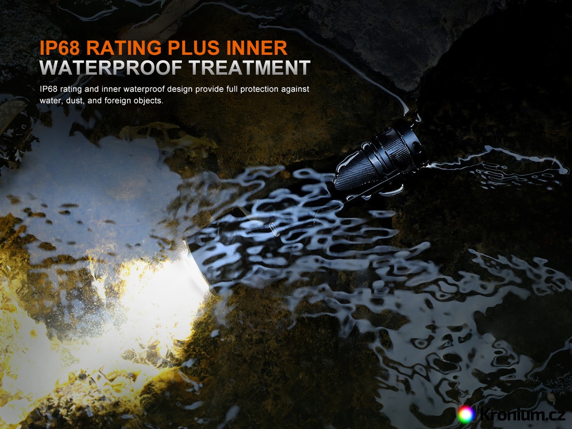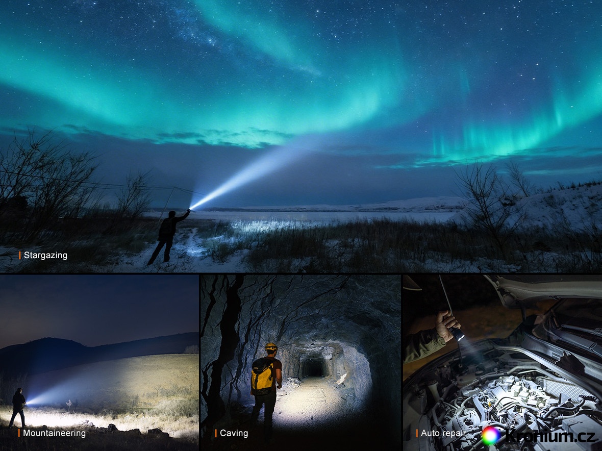 - Svítilna je vyrobena z leteckého tvrzeného hliníku 6061-T6 a je nárazuvzdorná pádům z výšky 1 metru.
