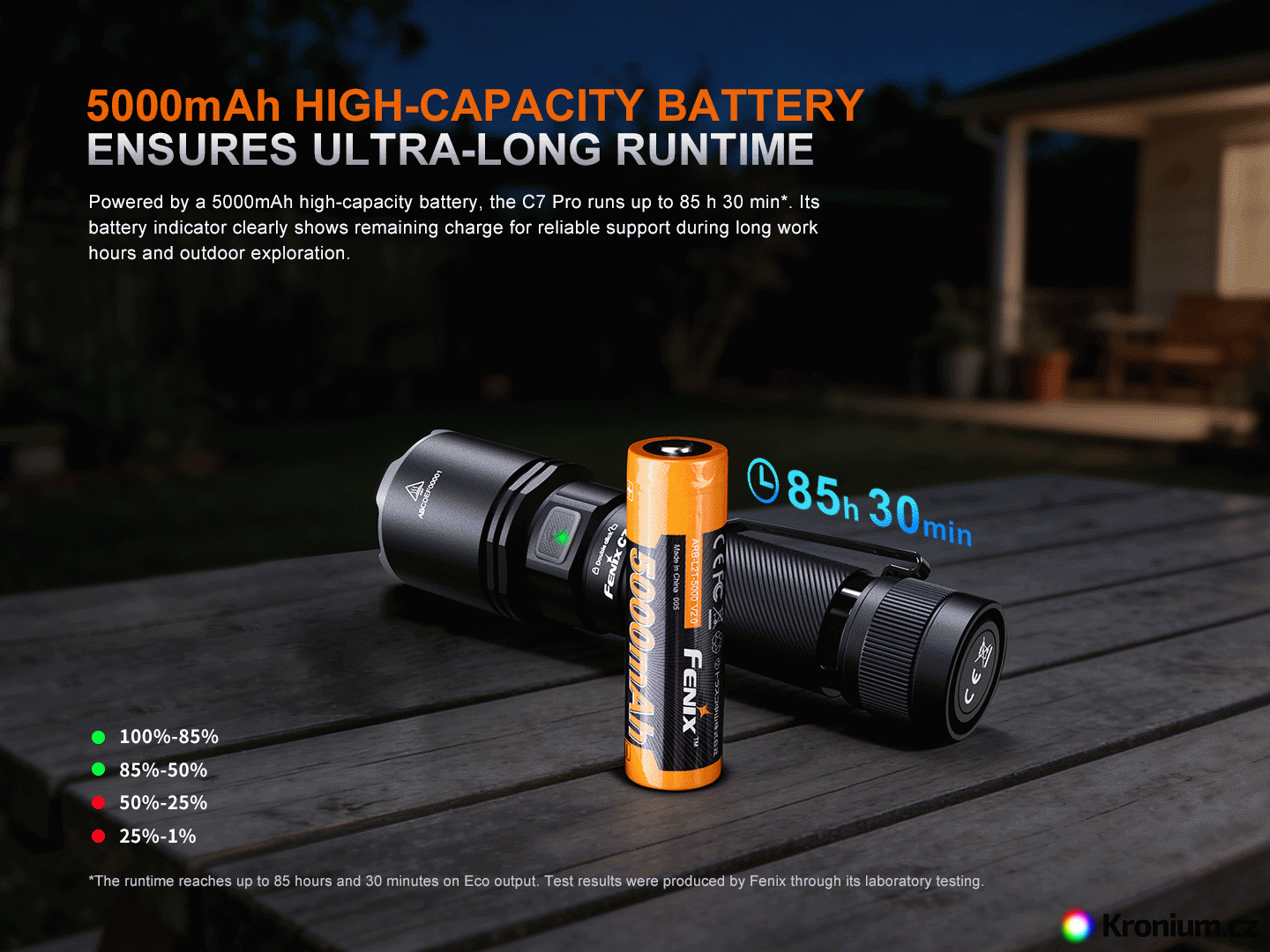 - Světelný tok a časy výdrže jsou měřeny s přibaleným Li-ion 21700 akumulátorem s kapacitou 5000 mAh.