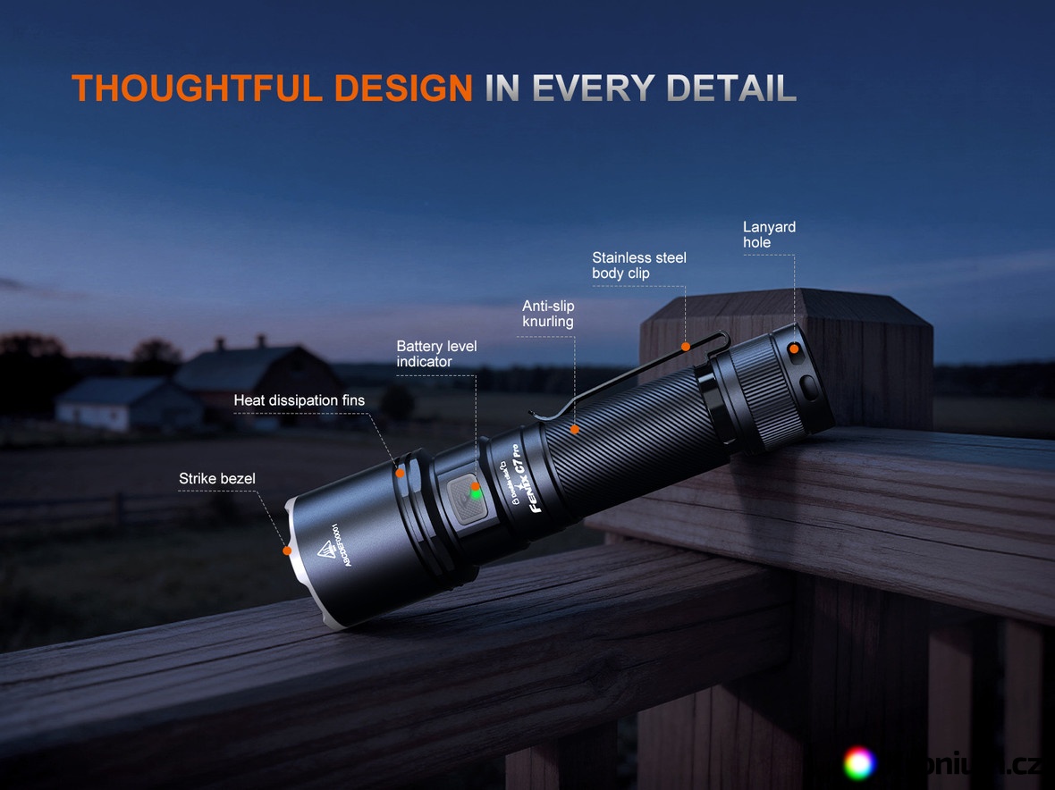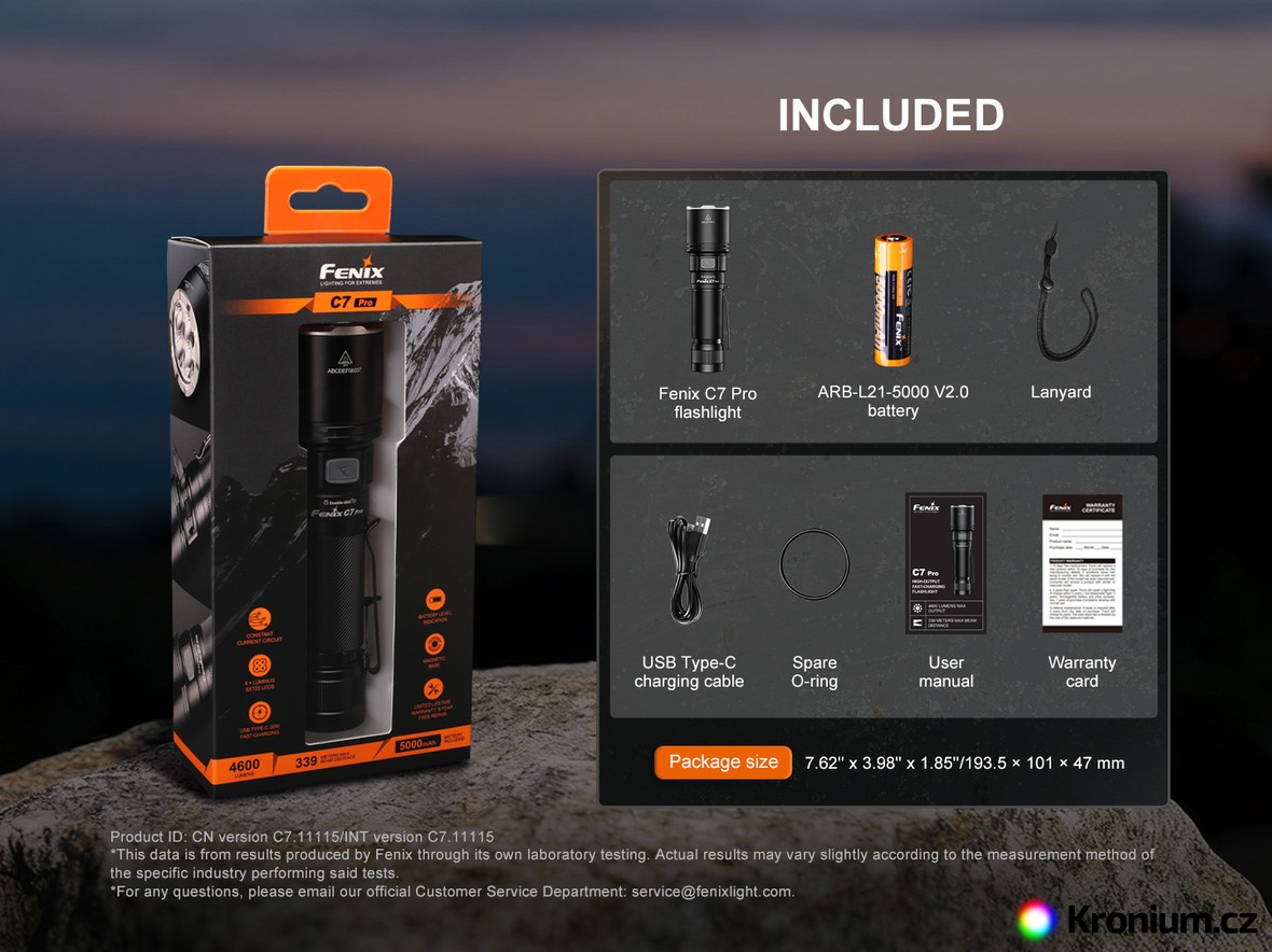 - Ke svítilně je přiložen akumulátor Fenix ARB-L21-5000 V2.0, nabíjecí USB-C kabel, šňůrka na zápěstí a náhradní o-kroužek.