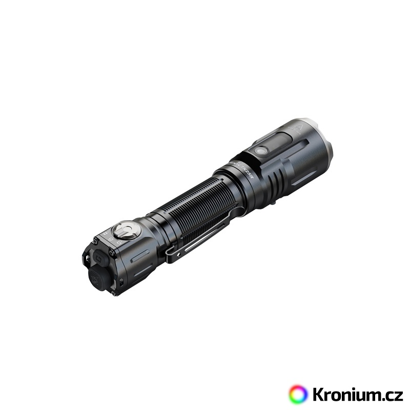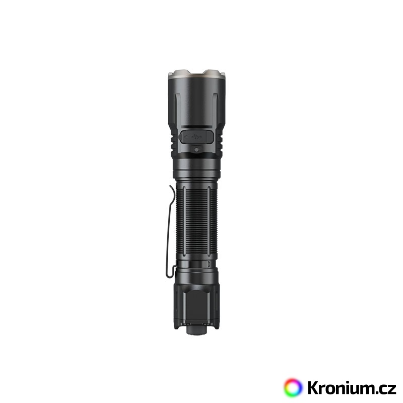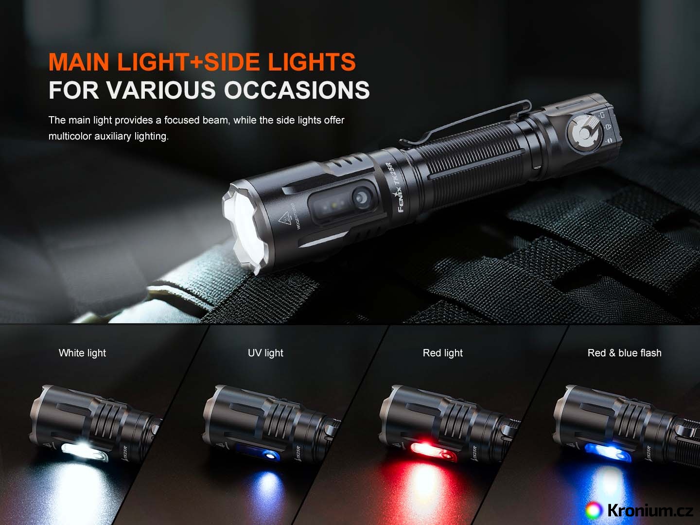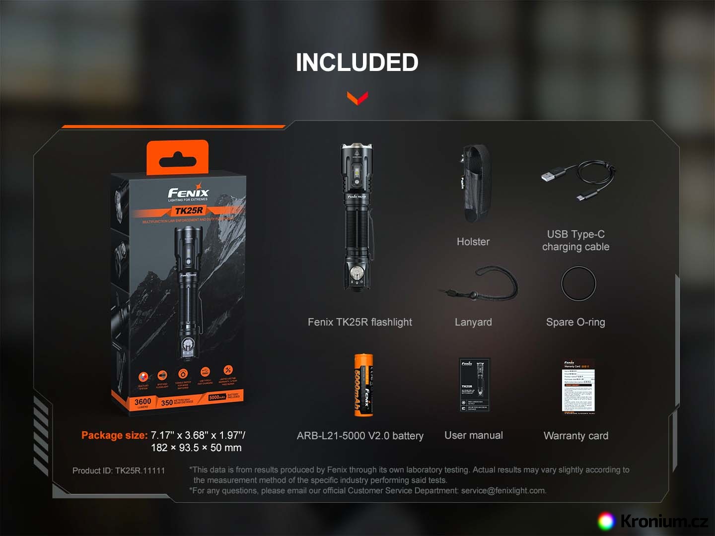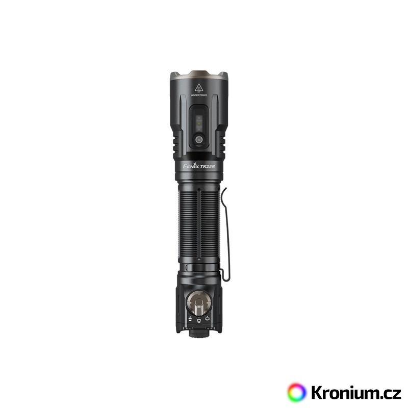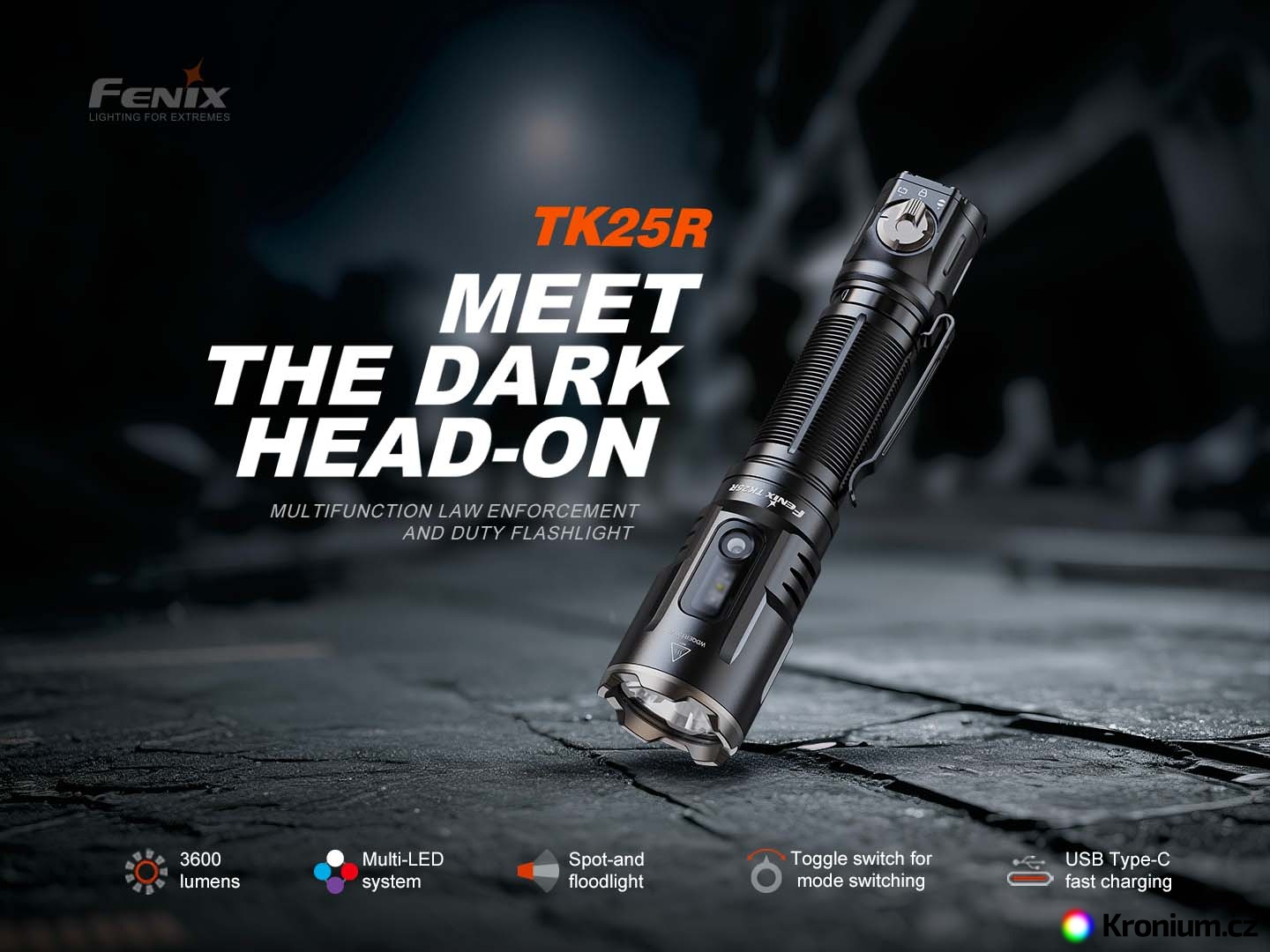 Fenix TK25R je špičková taktická svítilna, která nabízí vysoký výkon a univerzální využití díky kombinaci hlavního a bočního reflektoru. Hlavní reflektor s prémiovou LED Cree XHP50.3 poskytuje světelný tok až 3600 lumenů s dosvitem 350 metrů. Unikátní vlastností tohoto modelu je integrované boční světlo, které disponuje difuzním bílým, červeným a ultrafialovým světlem (365 nm) o výkonu až 700 mW, které umožní například rychlou kontrolu pravosti dokladů a bankovek, vytvrzování lepidel či kontrolu úniku kapalin. Dále je boční světlo vybaveno funkcí červeno-modrého blikání, což ocení zejména ozbrojené složky. Napájení zajišťuje Li-ion akumulátor typu 21700 (Fenix ARB-L21-5000 V2.0) s kapacitou 5000 mAh, který se nabíjí přes moderní USB-C konektor přímo na těle svítilny. Tělo je vyrobeno z odolné hliníkové slitiny A6061-T6 s tvrdou anodizací a je plně vodotěsné a prachotěsné dle standardu IP68.