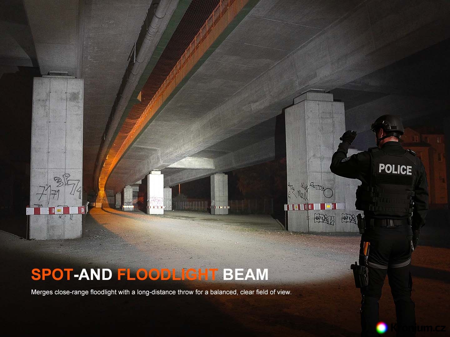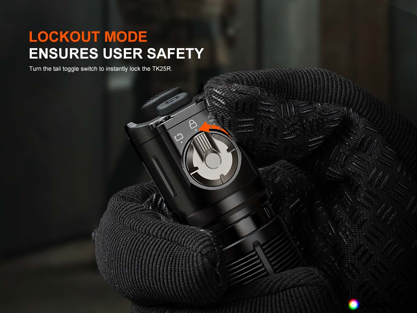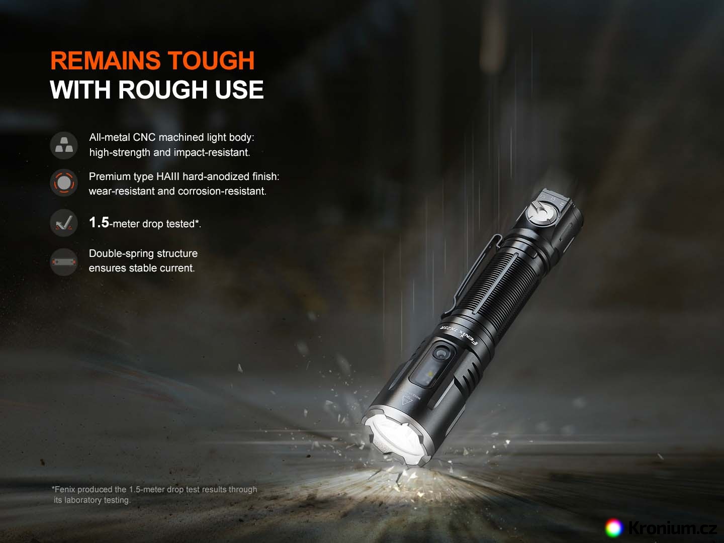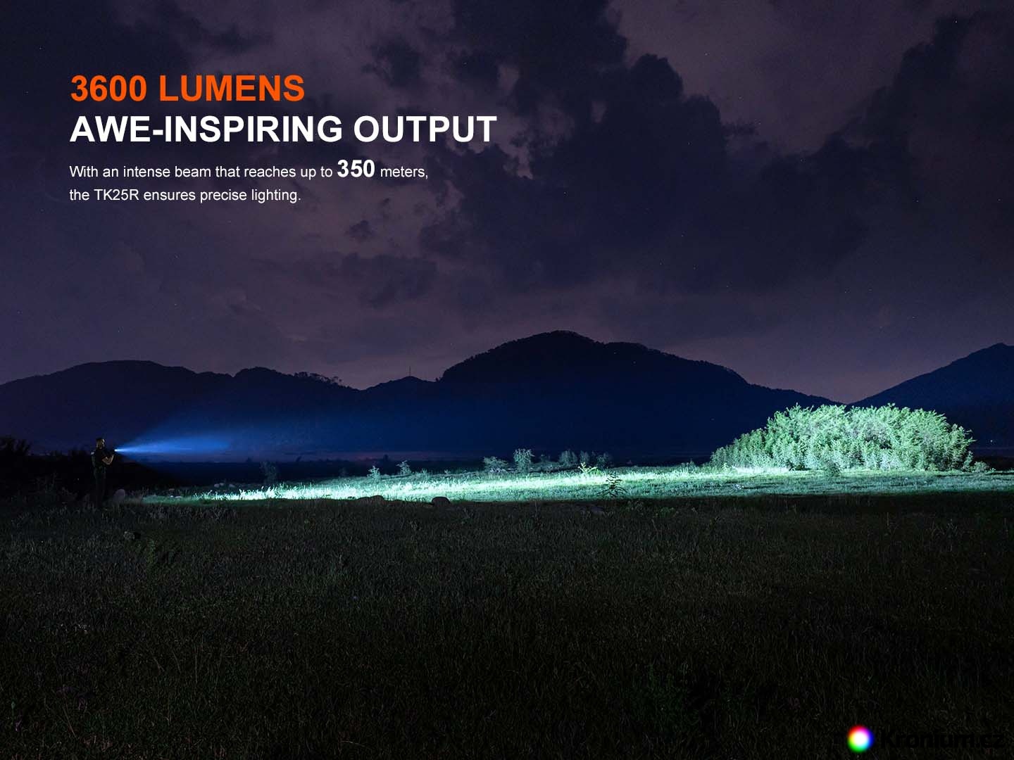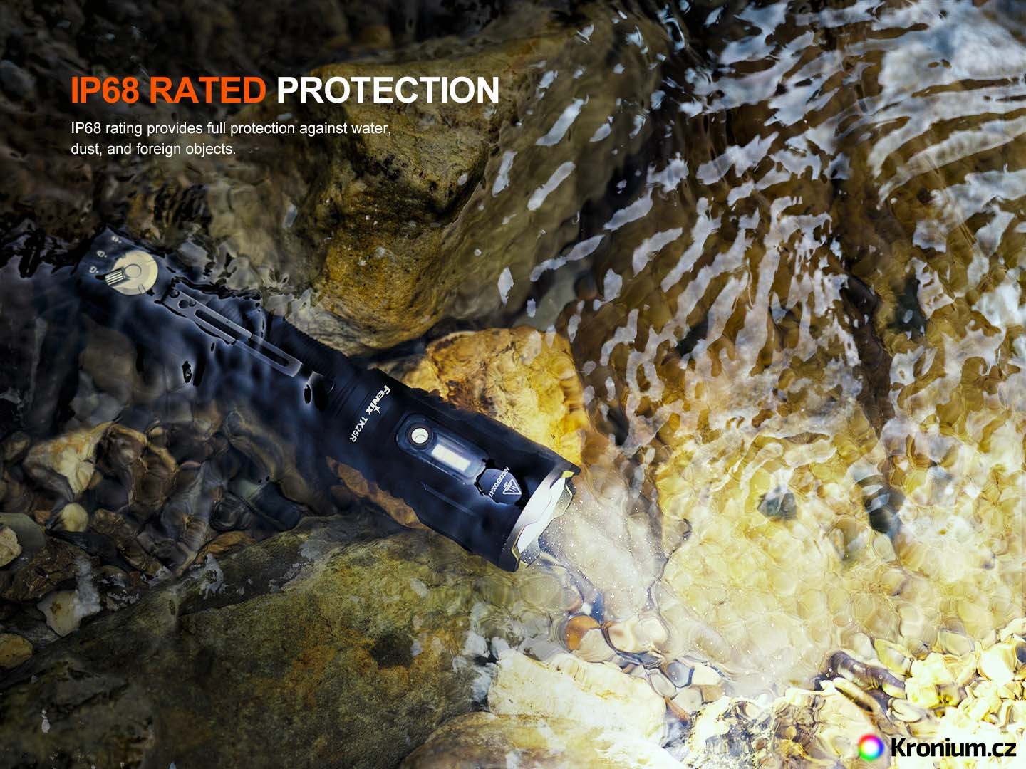 Fenix TK25R je špičková taktická svítilna, která nabízí vysoký výkon a univerzální využití díky kombinaci hlavního a bočního reflektoru. Hlavní reflektor s prémiovou LED Cree XHP50.3 poskytuje světelný tok až 3600 lumenů s dosvitem 350 metrů. Unikátní vlastností tohoto modelu je integrované boční světlo, které disponuje difuzním bílým, červeným a ultrafialovým světlem (365 nm) o výkonu až 700 mW, které umožní například rychlou kontrolu pravosti dokladů a bankovek, vytvrzování lepidel či kontrolu úniku kapalin. Dále je boční světlo vybaveno funkcí červeno-modrého blikání, což ocení zejména ozbrojené složky. Napájení zajišťuje Li-ion akumulátor typu 21700 (Fenix ARB-L21-5000 V2.0) s kapacitou 5000 mAh, který se nabíjí přes moderní USB-C konektor přímo na těle svítilny. Tělo je vyrobeno z odolné hliníkové slitiny A6061-T6 s tvrdou anodizací a je plně vodotěsné a prachotěsné dle standardu IP68.