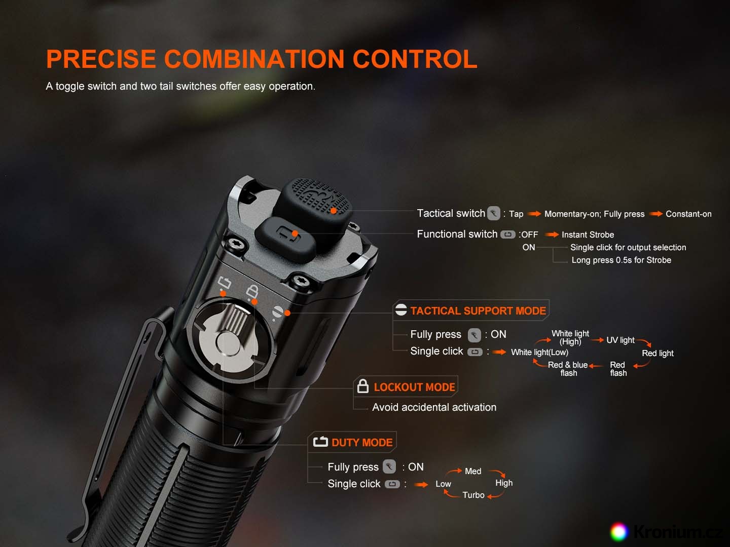 Fenix TK25R nabízí celkem pět režimů hlavního reflektoru včetně oslepujícího stroboskopu a šest režimů bočního světla (včetně červeného svícení pro zachování nočního vidění). K ovládání slouží taktický duální spínač v koncovce, který umožňuje momentální zapnutí, pohotové spuštění režimu turbo i okamžitou aktivaci stroboskopu. Tato ergonomie je ideální pro krizové situace, kdy je potřeba světlo použít rychle a bez hledání tlačítek.