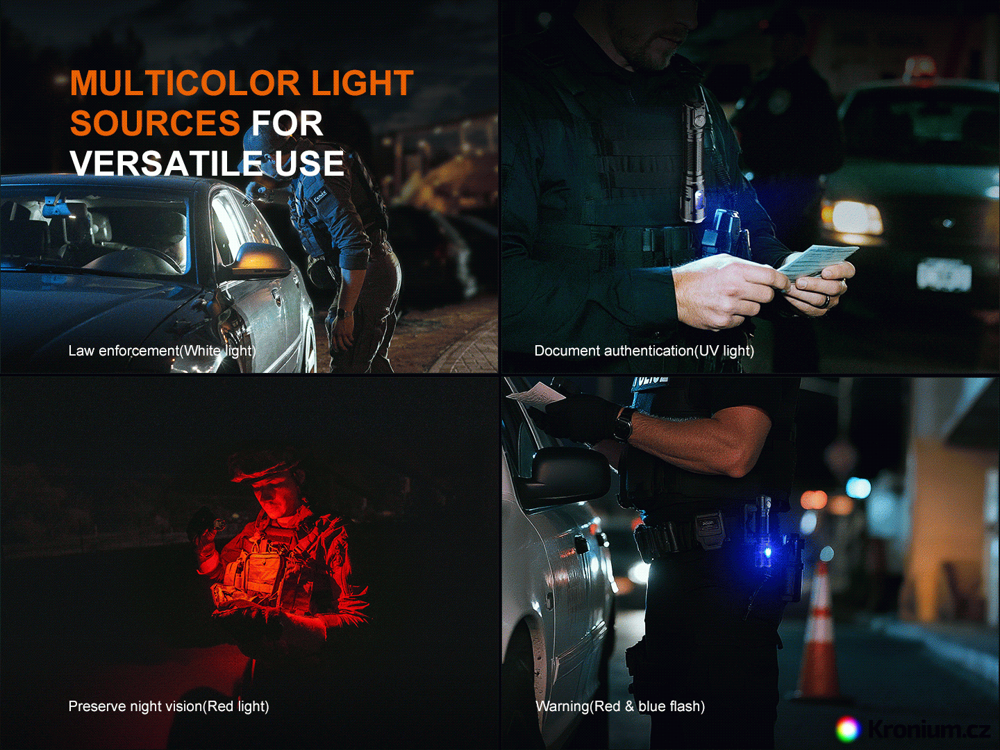- Šest režimů svícení bočního reflektoru: 150 lumenů (5 hodin) – 30 lumenů (50 hodin) – UV 365 nm (700 mW) – červená 15 lumenů (20 hodin) – červené blikání (15 lumenů) – červené a modré blikání (15 lumenů).