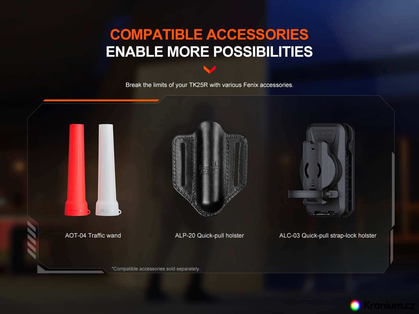- Jako volitelné originální příslušenství lze dokoupit dopravní kužel AOT-04, kožené pouzdro ALP-20, dtřák svítilny ALC-03, popruh Fenix ALD-05 pro použití svítilny na přilbě, držák na kolo Fenix, USB adaptér do elektrické sítě a USB adaptér do auta.