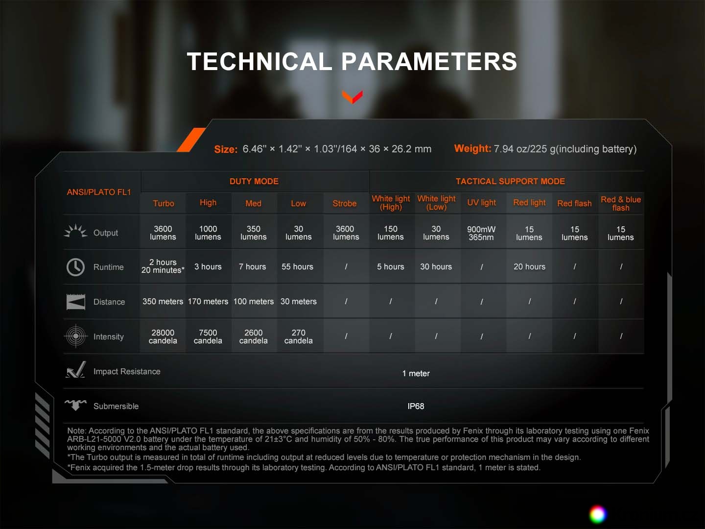 Všechny parametry svítilny (světelný tok, doba provozu na baterie, vodotěsnost, dosvit a nárazuvzdornost) jsou změřeny v souladu s normou ANSI/NEMA FL 1-2009.