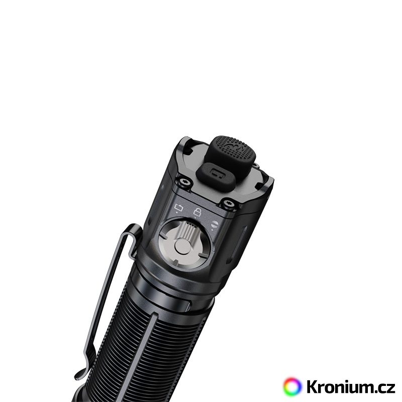 - Nabíjecí USB-C konektor na těle svítilny pod gumovou krytkou.