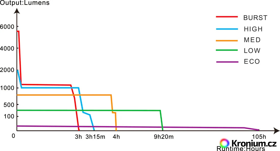 - Šest režimů bílého světla: 5800 lumenů (3 hodiny) -> 2000 lumenů (3 h 15 min) -> 800 lumenů (4 hodiny) -> 350 lumenů (9 h 20 min) -> 30 lumenů (105 hodin) -> stroboskop 3000 lumenů