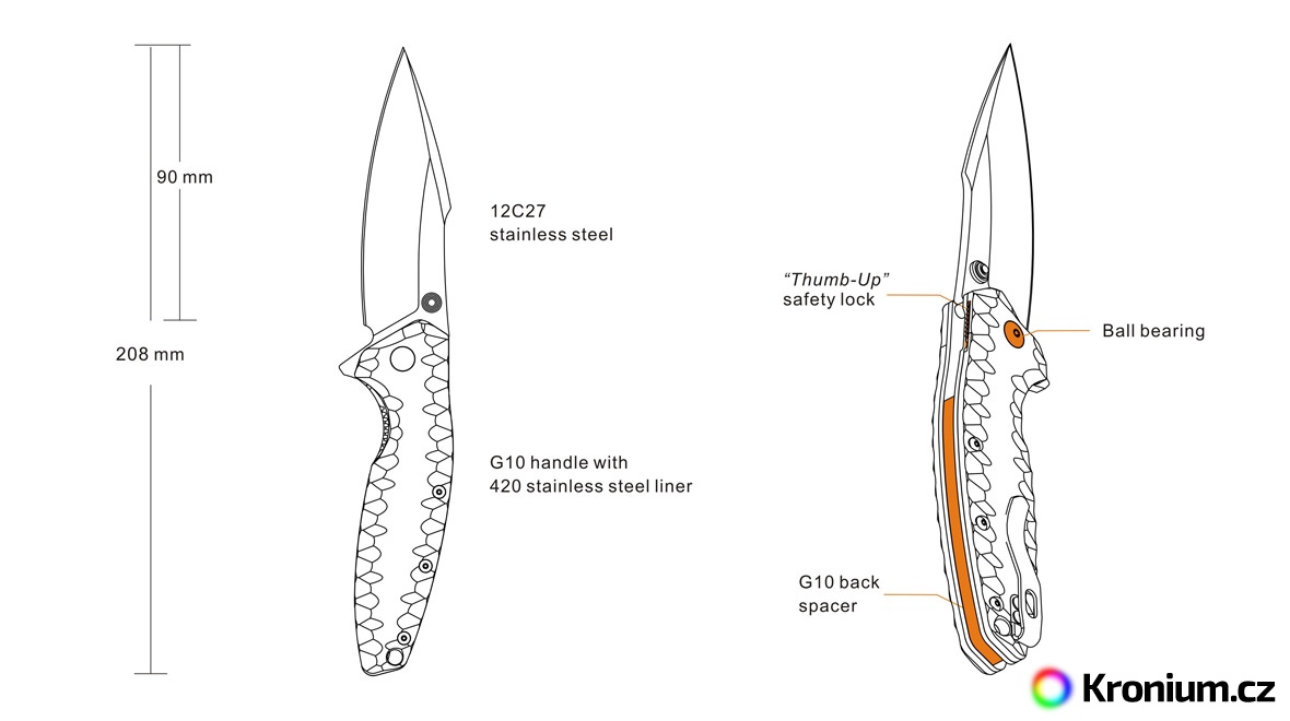 - Materiál čepele: Sandvik 12C27 nerezová ocel