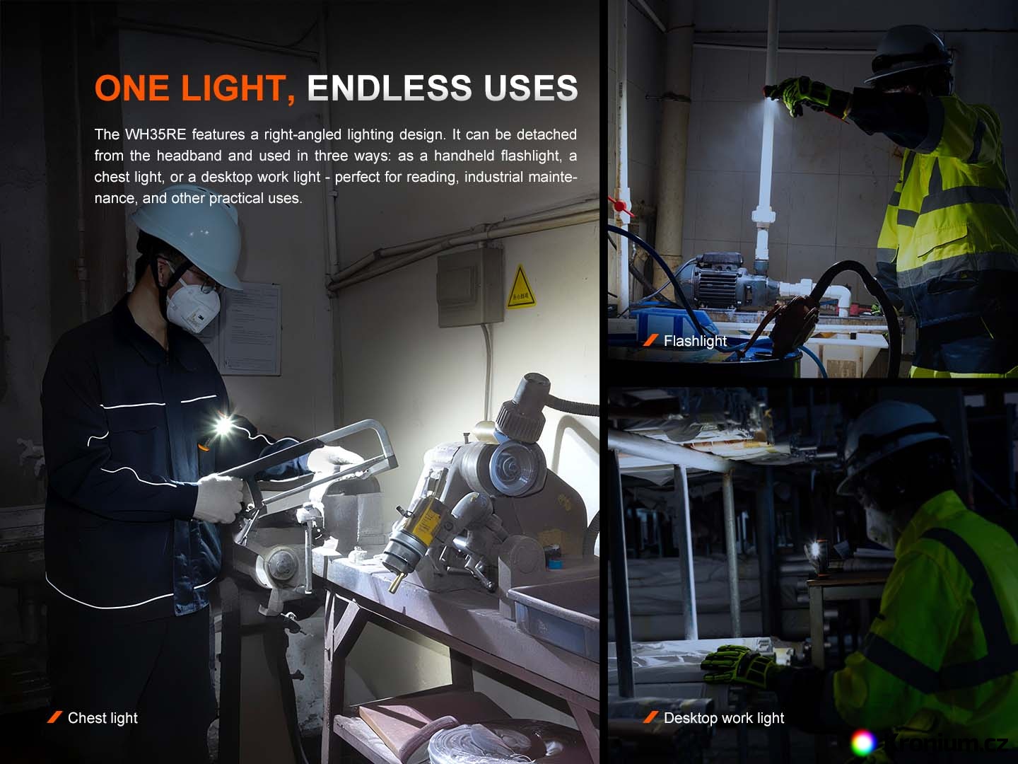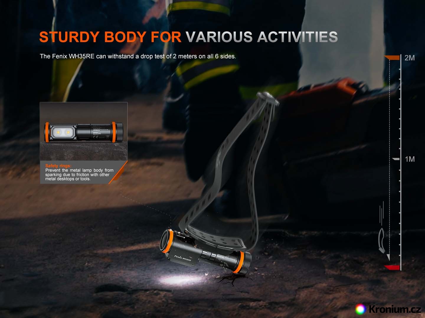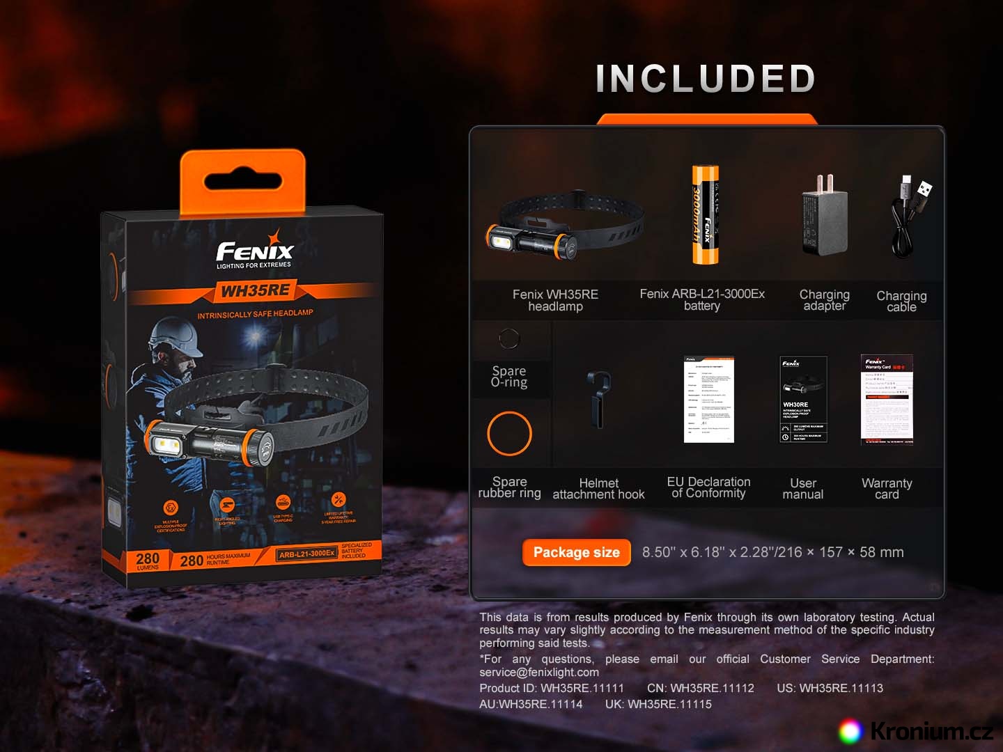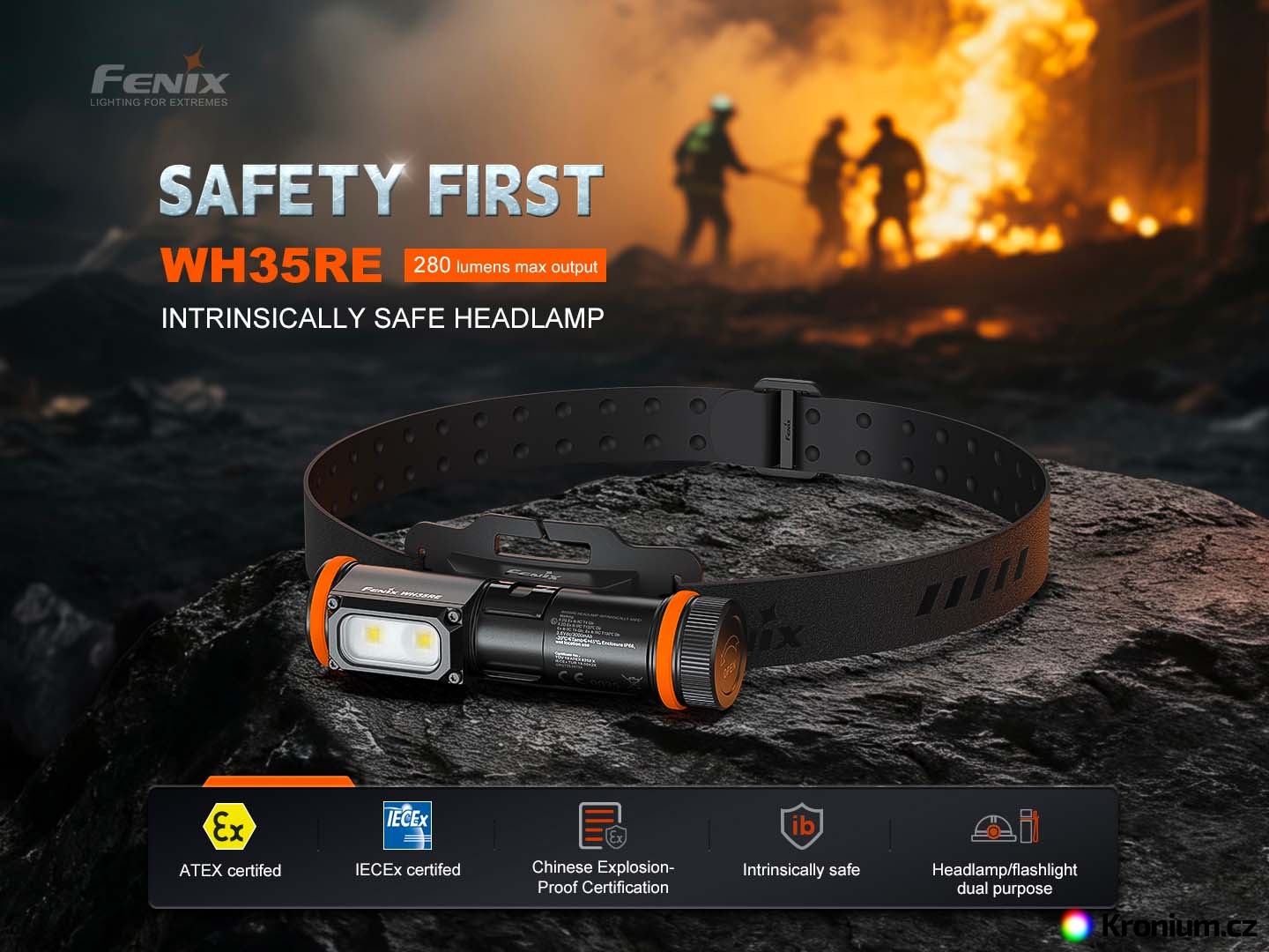 Fenix WH35RE je bezpečná pracovní čelovka do výbušného prostředí, určená pro různé oblasti s rizikem výbuchu, kromě podzemních dolů. Je opatřena certifikací ATEX/IECex. Nabízí maximální výkon 280 lumenů a napájí ji jeden speciálně upravený Li-ion akumulátorem ARB-L21-3000Ex s kapacitou 3000 mAh (je součástí balení), který se dobíjí přímo ve svítilně přes moderní USB-C konektor. Praktičnost čelovky zvyšuje možnost vyjmout světlo z hlavového držáku a používat ji i jako kapesní či pracovní svítilnu. Navíc je čelovka opatřena ocelovou odnímatelnou sponou, takže ji snadno uchytíte na kapsu či popruh. Její velký spínač umožňuje jednoduché a přesné ovládání – dokonce i v rukavicích.