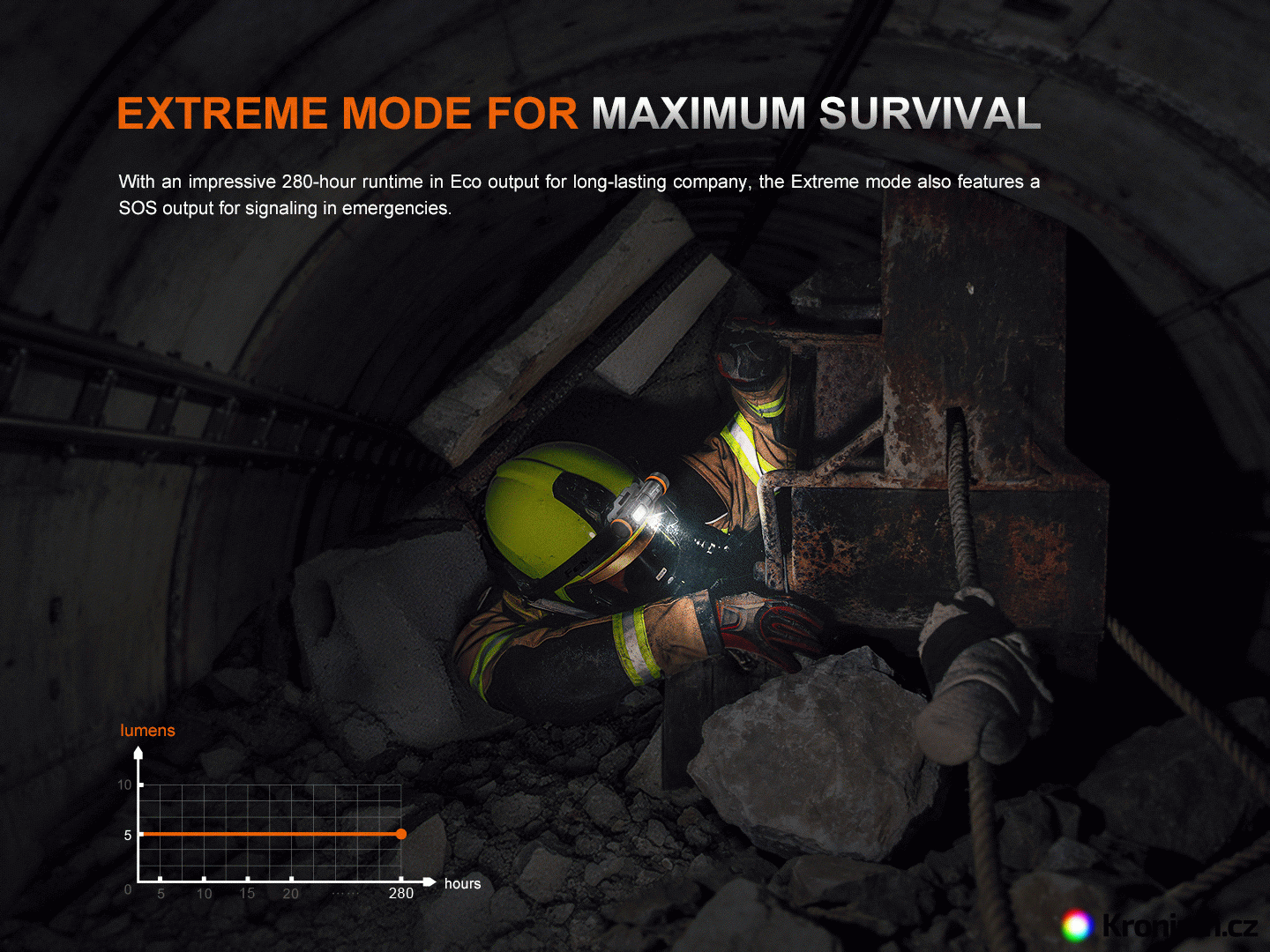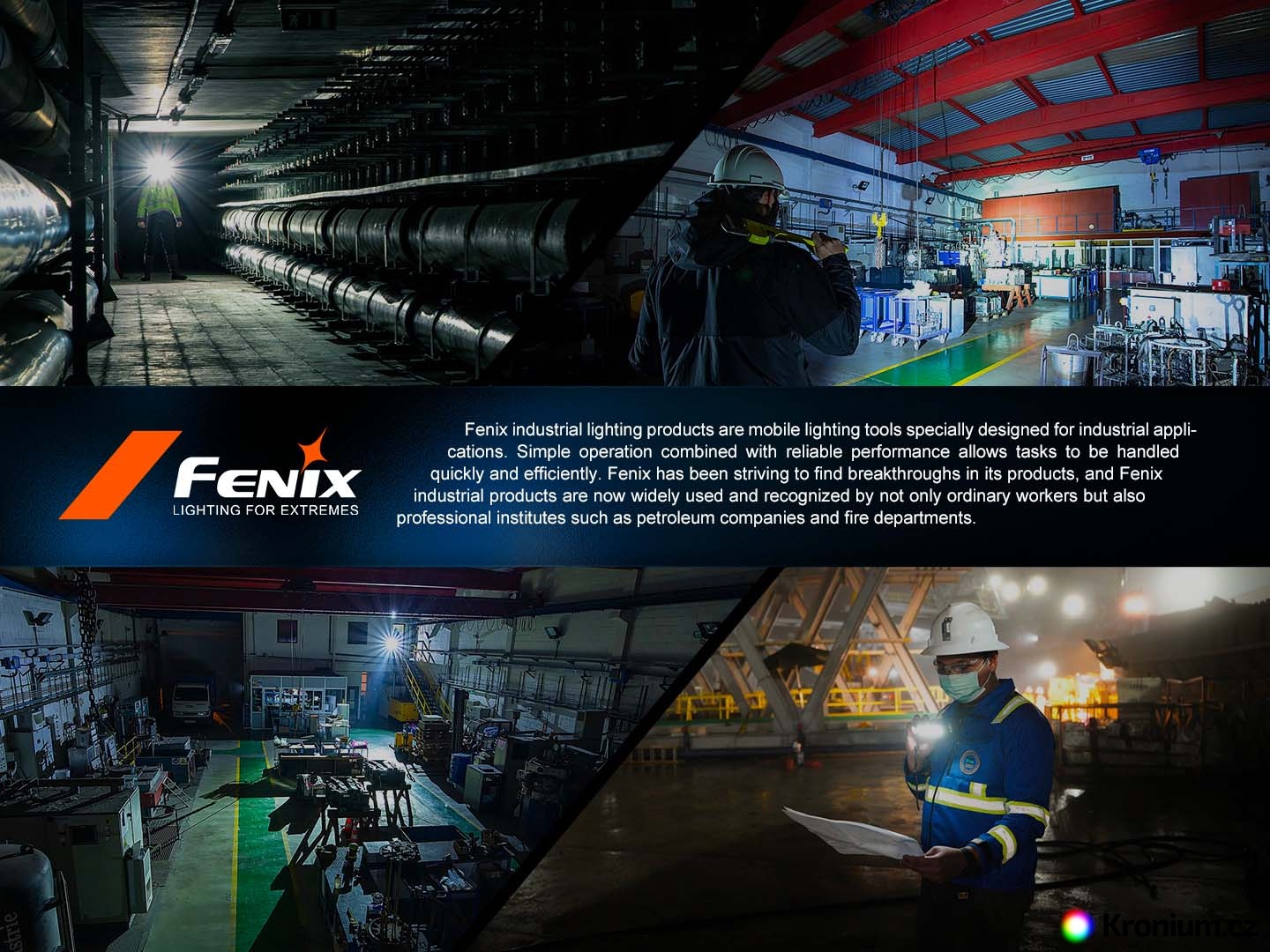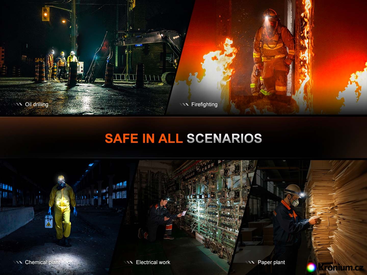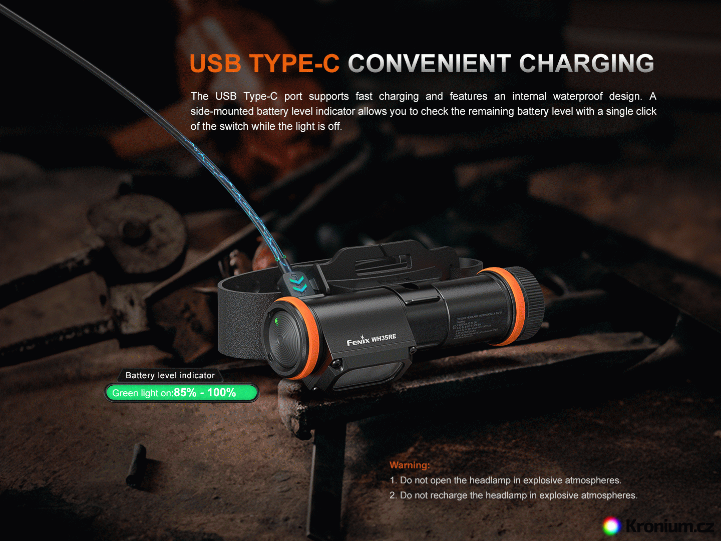 Fenix WH35RE je bezpečná pracovní čelovka do výbušného prostředí, určená pro různé oblasti s rizikem výbuchu, kromě podzemních dolů. Je opatřena certifikací ATEX/IECex. Nabízí maximální výkon 280 lumenů a napájí ji jeden speciálně upravený Li-ion akumulátorem ARB-L21-3000Ex s kapacitou 3000 mAh (je součástí balení), který se dobíjí přímo ve svítilně přes moderní USB-C konektor. Praktičnost čelovky zvyšuje možnost vyjmout světlo z hlavového držáku a používat ji i jako kapesní či pracovní svítilnu. Navíc je čelovka opatřena ocelovou odnímatelnou sponou, takže ji snadno uchytíte na kapsu či popruh. Její velký spínač umožňuje jednoduché a přesné ovládání – dokonce i v rukavicích.