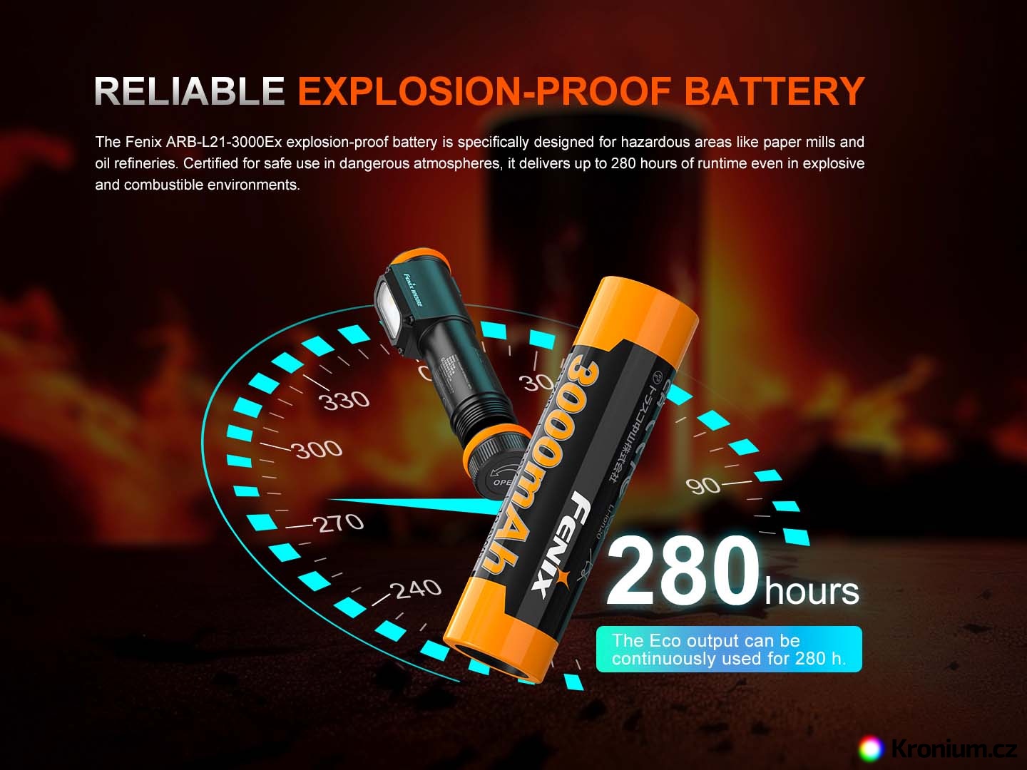- Používá speciální Li-ion akumulátor Fenix ARB-L21-3000Ex s kapacitou 3000 mAh. Jedná se o upravený typ certifikovaný pro výbušná prostředí.