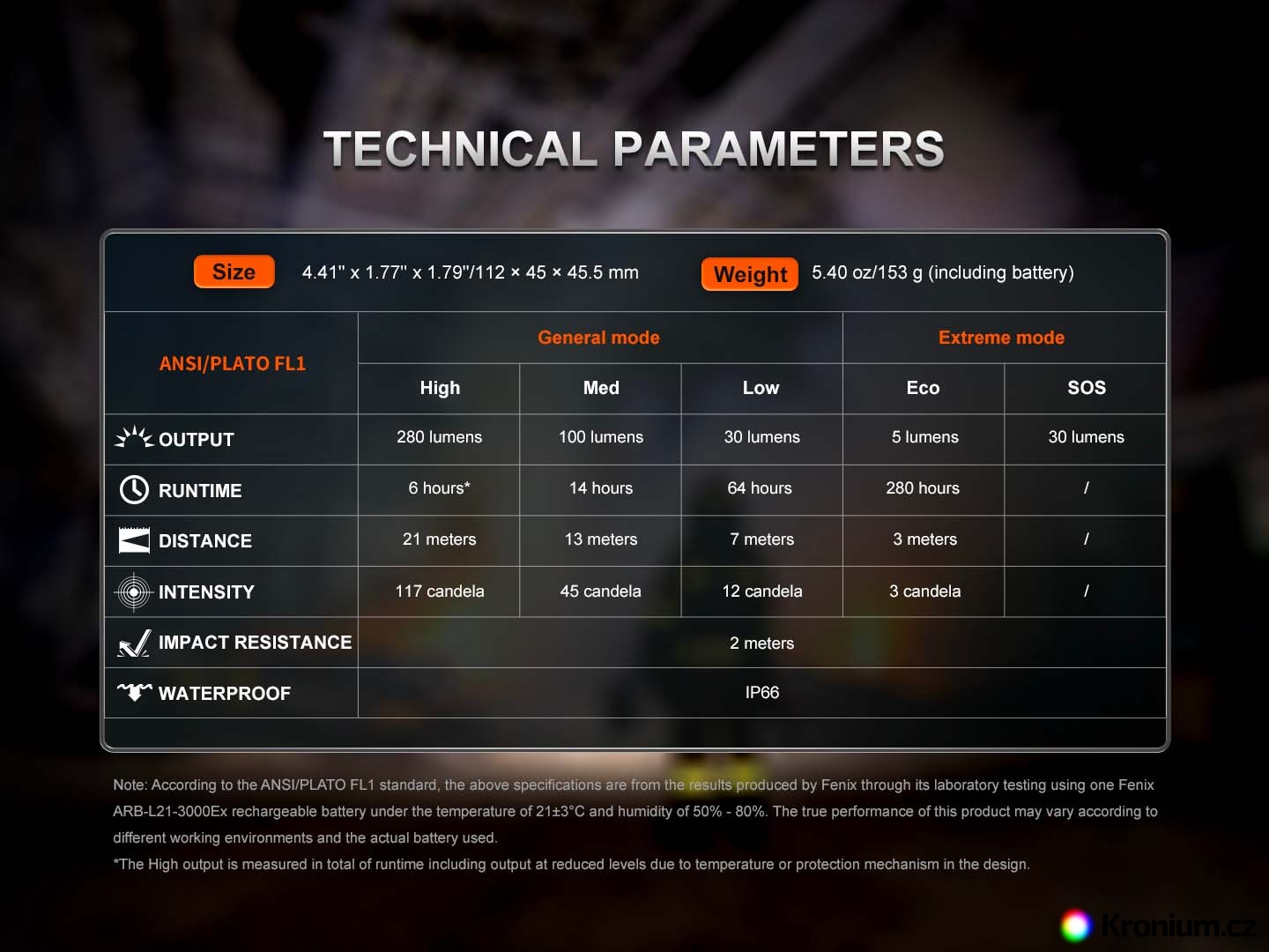 - Pět režimů bílého světla: 280 lumenů (6 hodin) -> 100 lumenů (14 hodin) -> 30 lumenů (64 hodin) -> 5 lumenů (280 hodin) -> SOS 30 lumenů.