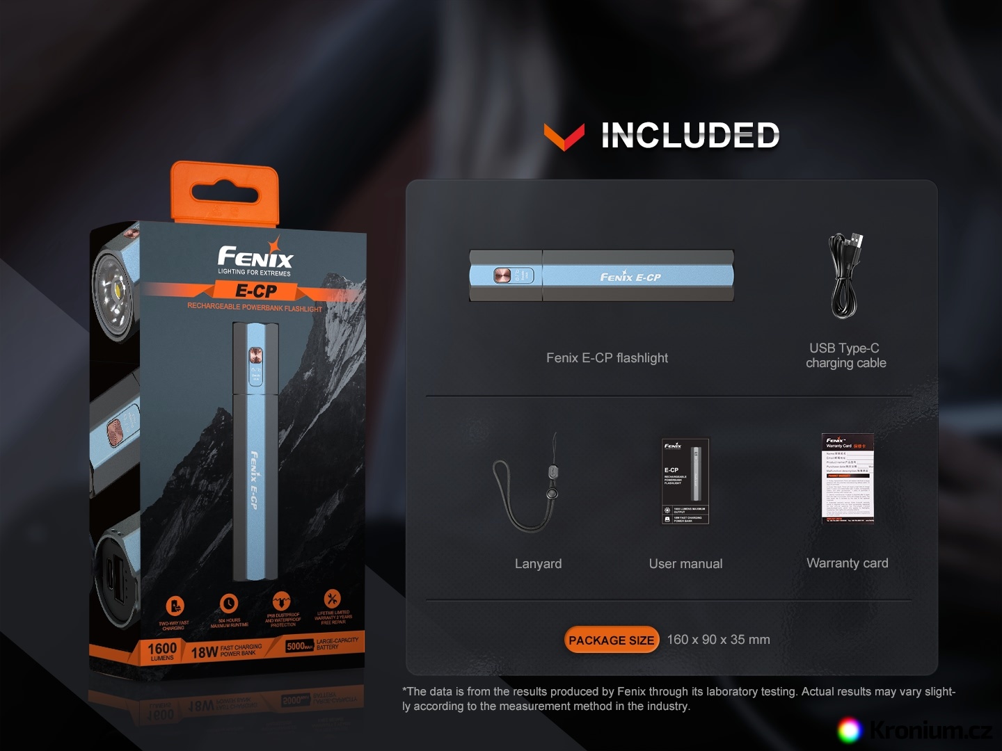 Fenix E-CP v sobě kombinuje funkci ruční svítilny se světelným tokem až 1600 lumenů a powebanky s kapacitou 5000 mAh. Napájení zajišťuje vestavěný Li-ion akumulátor o kapacitě 5000 mAh, který lze dobíjet prostřednictvím moderního USB-C konektoru. Světelná dioda Luminus SST-40 ukrytá pod TIR optikou dokáže dosvítit až na vzdálenost 222 metrů a v nejnižším režimu vydrží svítit až 504 hodin. Powerbanka podporuje rychlonabíjecí protokoly a dokáže nabíjet výkonem až 18W (5V/2,4A, 9V/2A, 12V/1,5A). Fenix E-CP je skvěle přenosná EDC svítilna a powerbanka v jednom, pro dobíjení vašeho mobilního telefonu a další přenosné elektroniky. Perfektně však zapadne například i do vašeho outdoor setu, pokud vyrážíte na delší dobu mimo dosah elektrické sítě.